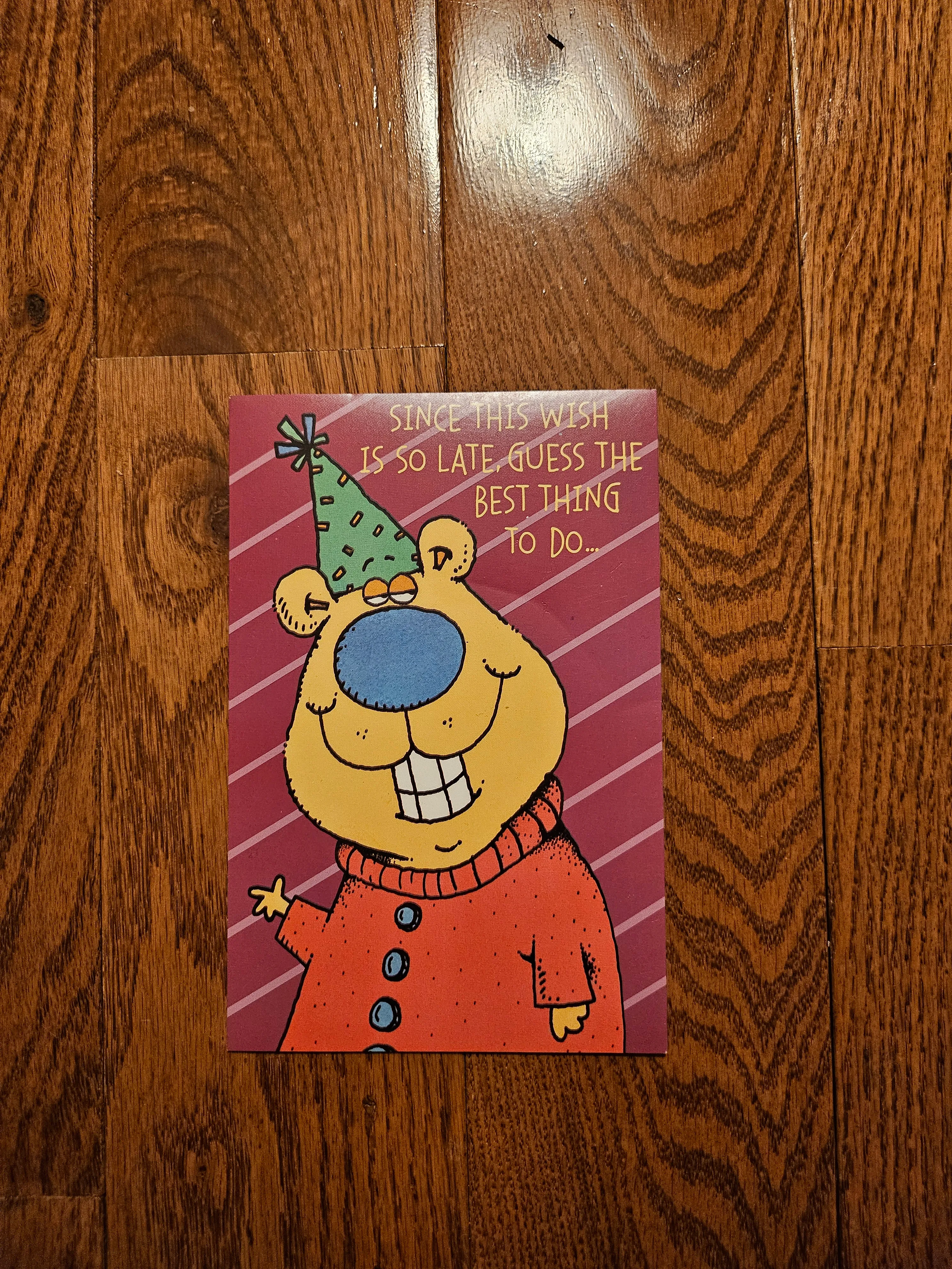 Belated birthday card. Has a bit of a dent in it but it's the thought that counts.