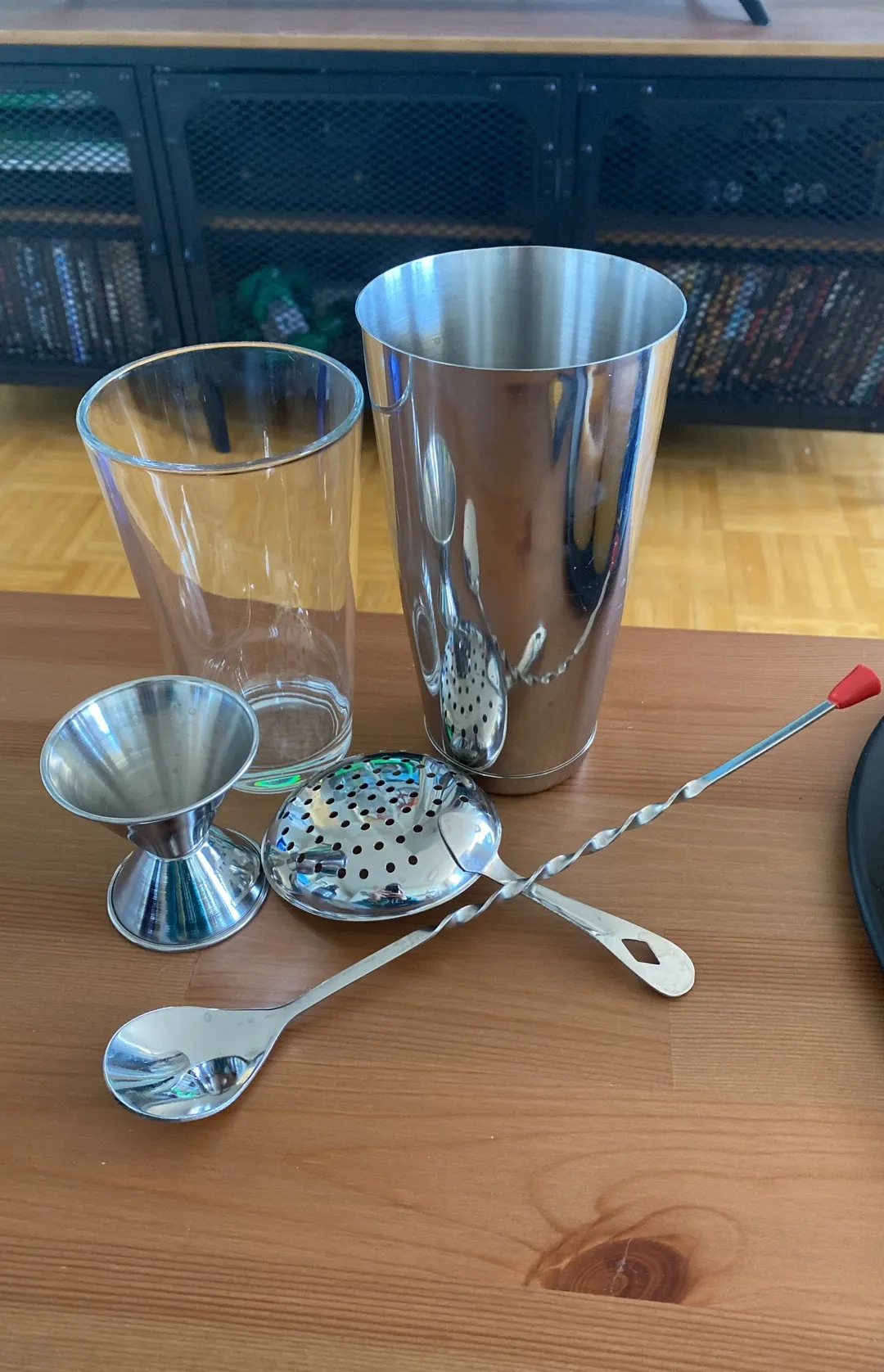 Includes cheating tin, jigger, bar spoon and strainer from bar chef