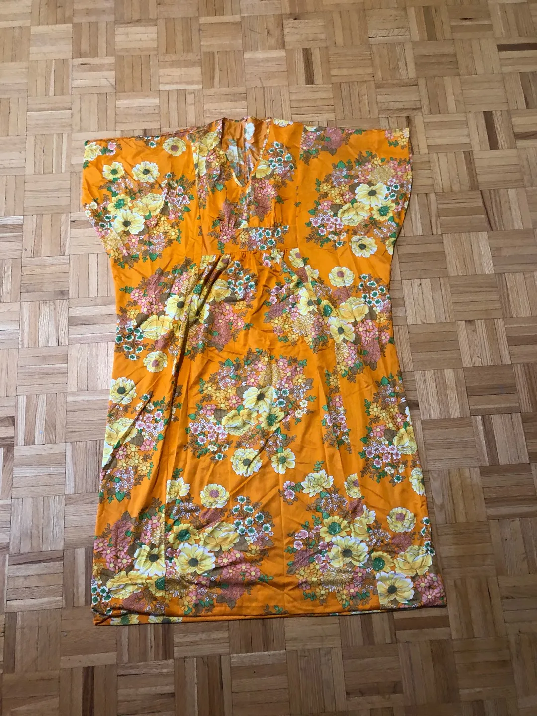 Full polyester glory. Bright orange with flowers. Super comfy- worn once to a mad men party. Great for Same, Halloween, or Trixie Mattel tribute. Full length (for about 5’7”)