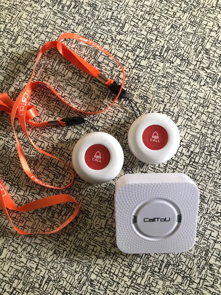 Comes with two buttons with lanyards and two plug in light up notifying alarms. Wear the button or mount it to a wall near a bed or bathroom, and put the alarm at neighbours. Great distance on these, basically new. Used for my grandma when she needed help but can be used in a variety of ways. Retail for $70 on amazon