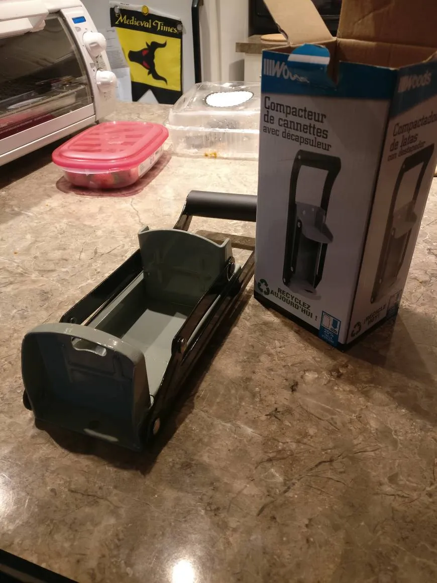 Got this sweet can crusher and was super excited until I realized it ONLY DOES REGULAR SIZED CANS. (255mL or whatever it is). DOES NOT FIT TALL CANS which is unfortunate, that's all the boyfriend drinks heh.