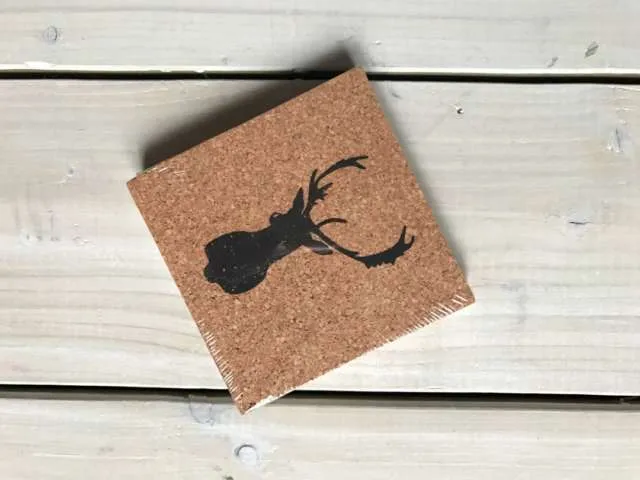 Stag antler silhouette on cork coaster. Set of 4 in package.