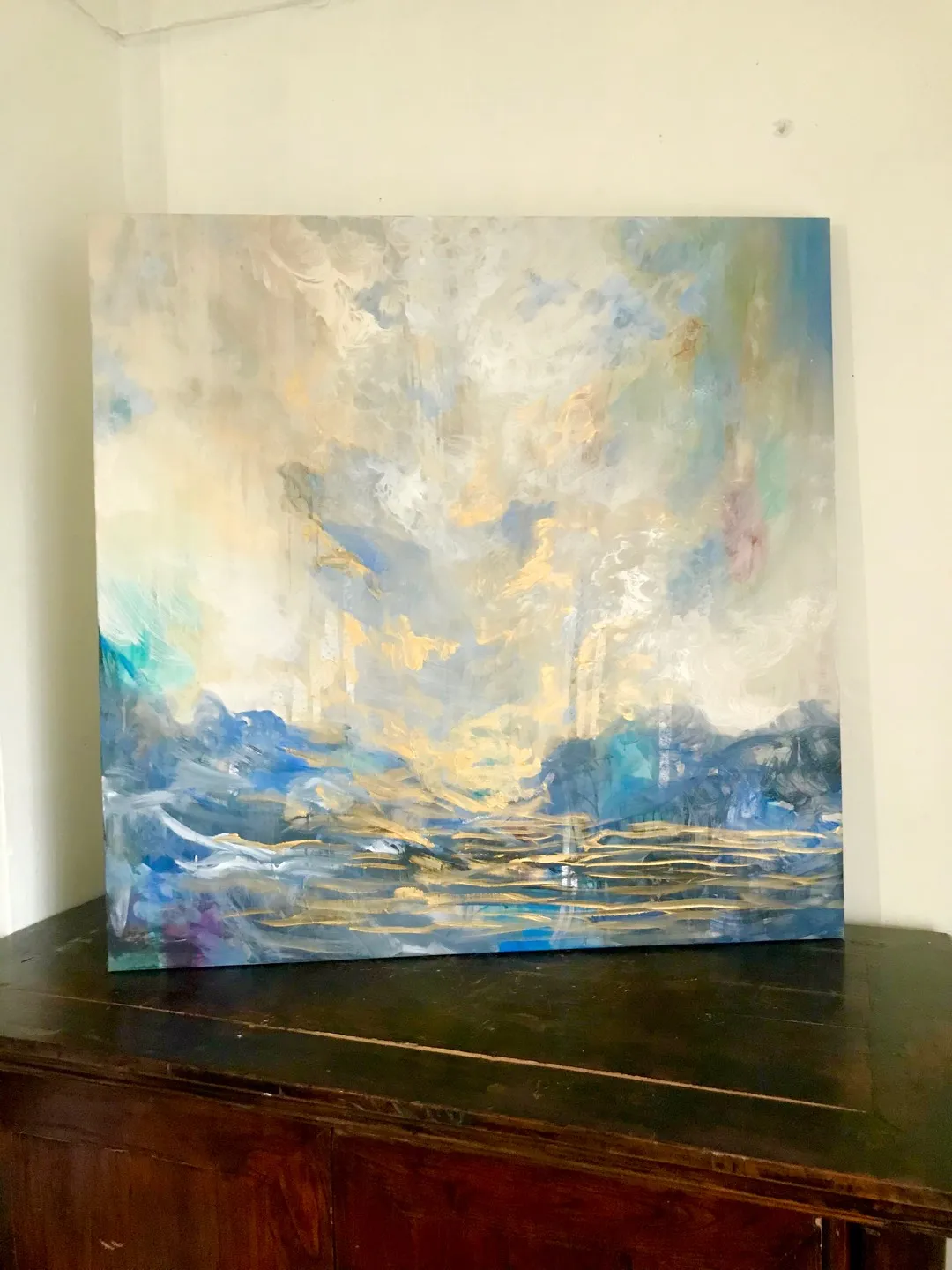 Painted with cobalt and Tiffany blues, golds and ivory. Warm up piece this morning before I get busy on a few large canvases. 1” deep profile stretched canvas. Should be dry soon...#artzone #art #handmade #cobalt