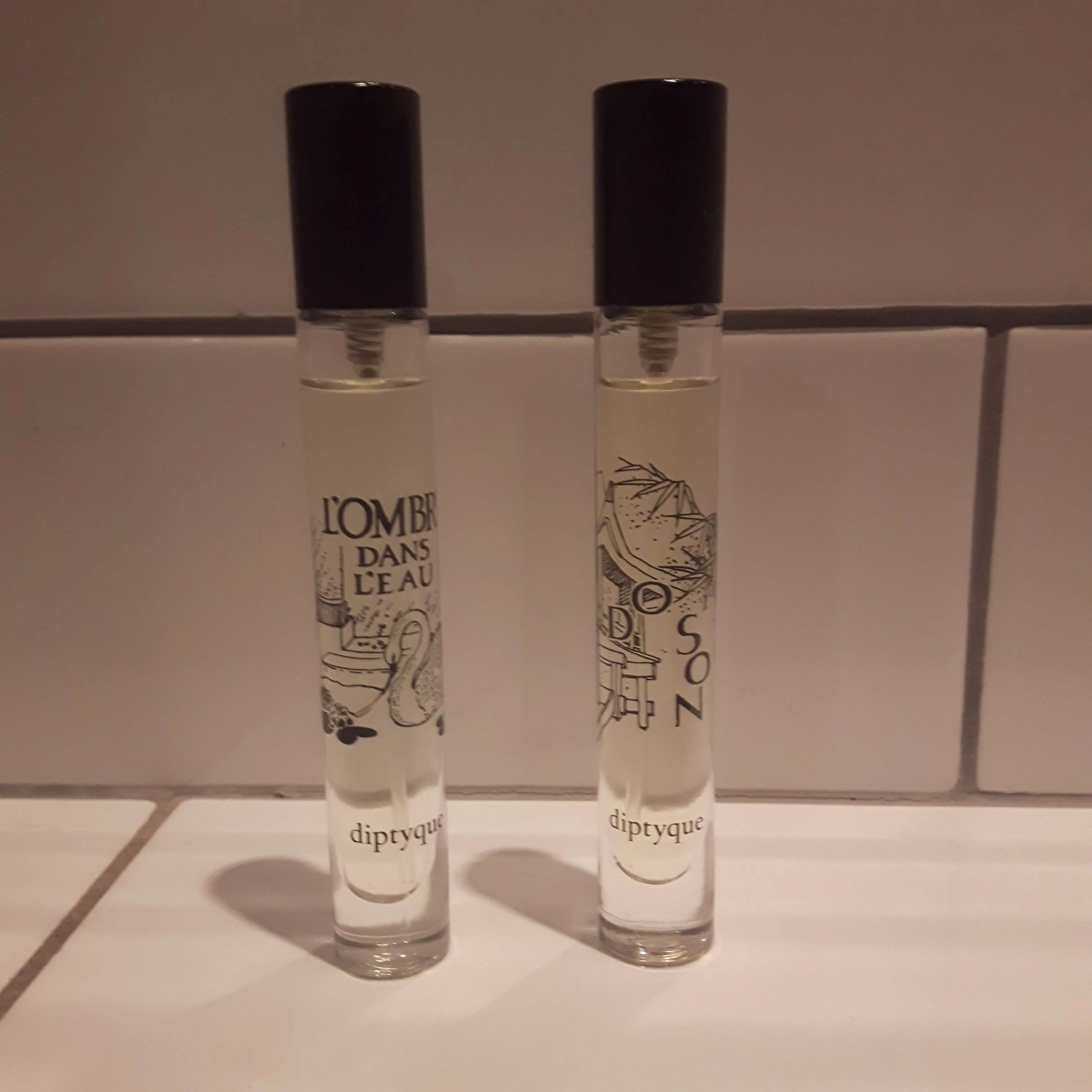 Two Diptyque spray perfumes in glass bottles. Almost full L'ombre Dans L'eau Doson