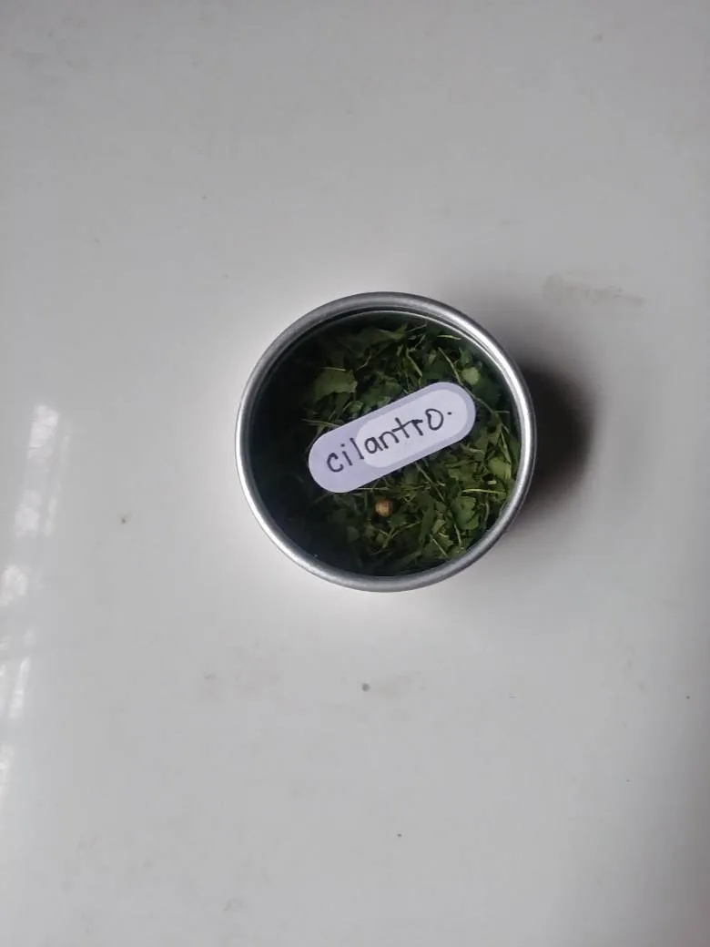 One small watchmaker's container of cilantro, dried in my dehydrator from fresh.