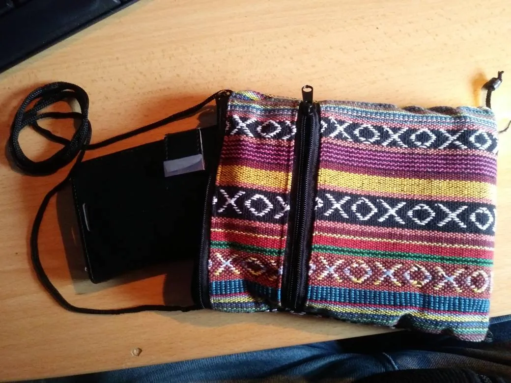 Multi-coloured stitch fabric 2 compartments perfect for a phone and a small wallet or card holder. 6" X 5 3/4" by Ten Thousand Villages