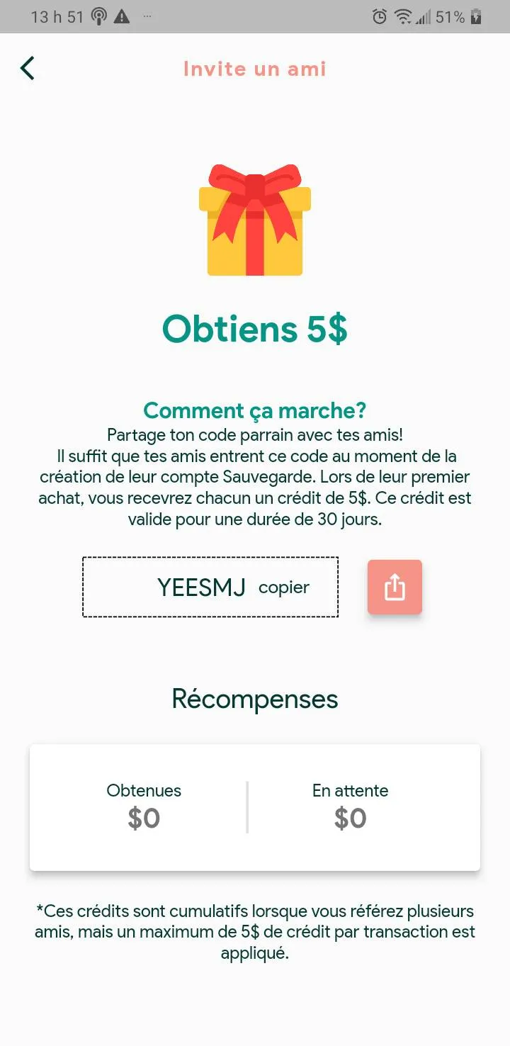 Salut! Télécharge l'application Sauvegarde et inscris-toi pour obtenir un crédit de 5$ avec mon code YEESMJsur ta première commande. Pour ios: https://apps.apple.com/in/app/sauvegarde/id1527634979 Pour Android: https://play.google.com/store/apps/details?id=com.sauvegarde.market