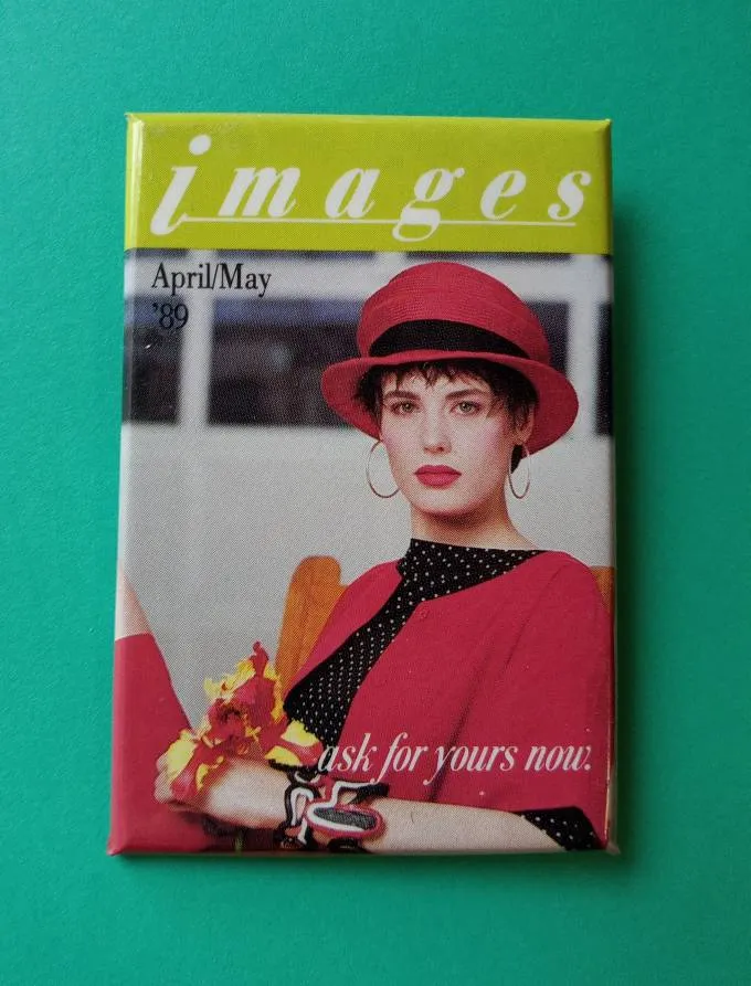 A pinback button of the cover of Images Magazine April/May 1989 edition. I have more than thirty of them, in case someone wants them for an art project or something. Free with trade or pick up.