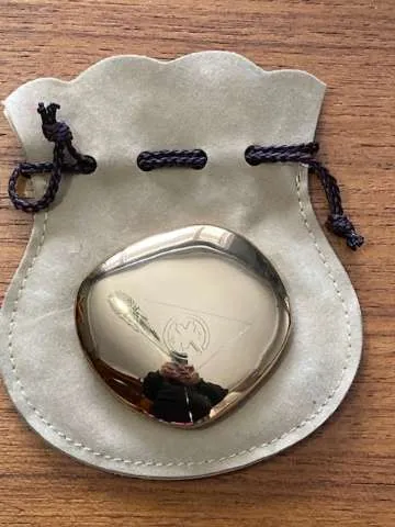 Air Canada symbol on it. Very heavy. Approx 2" across. With suede drawstring bag. Signed and made in France.