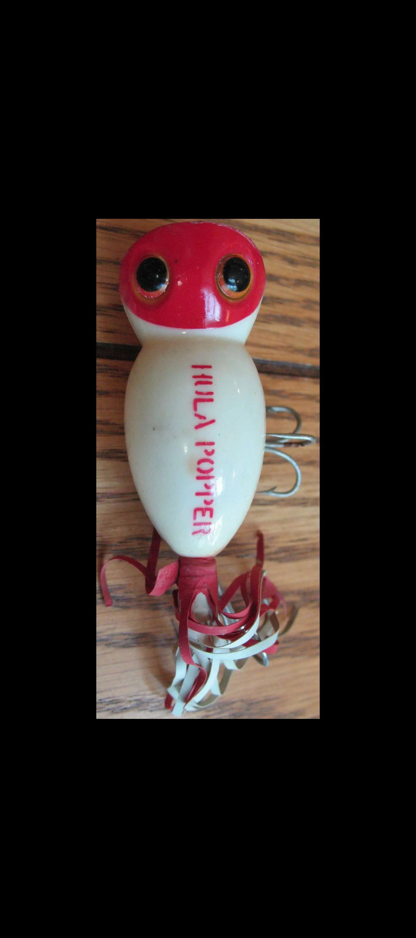Offered here is this vintage Hula Popper lure. It is a red head with white body. This one is 2.75" in length, measured from the top lip to the nub that holds the rubber skirt. The only thing to note is that the rubber skirt has obviously seen better days, otherwise the lure is primo.