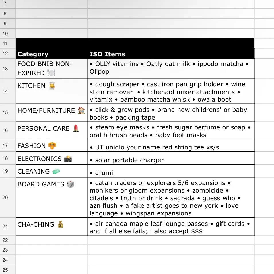FOOD BNIB NON-EXPIRED 🍽️ • OLLY vitamins • Oatly oat milk • ippodo matcha • Olipop KITCHEN 👩🍳 • dough scraper • cast iron pan grip holder • wine stain remover • kitchenaid mixer attachments • vitamix • bamboo matcha whisk • owala boot HOME/FURNITURE 🏠 • click & grow pods • brand new childrens' or baby books • packing tape PERSONAL CARE 💄 • steam eye masks • fresh sugar perfume or soap • oral b brush heads • baby foot masks FASHION 👘 • UT uniqlo your name red string tee xs/s ELECTRONICS 📸 • solar portable charger CLEANING 🧼 • drumi BOARD GAMES 🎲 • catan traders or explorers 5/6 expansions • monikers or gloom expansions • zombicide • citadels • truth or drink • sagrada • guess who • azn flush • a fake artist goes to new york • love language • wingspan expansions CHA-CHING 💰 • air canada maple leaf lounge passes • gift cards • and if all else fails; i also accept $$$