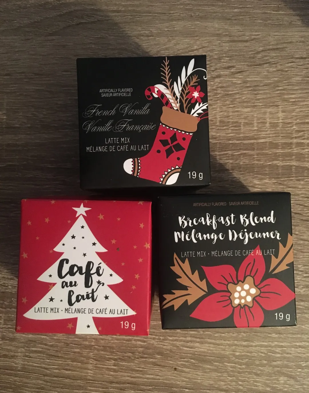 Powdered latte mixes, just add water or milk if your choice! Makes once cup per box. -French Vanilla -Breakfast blend -Cafe au Lait