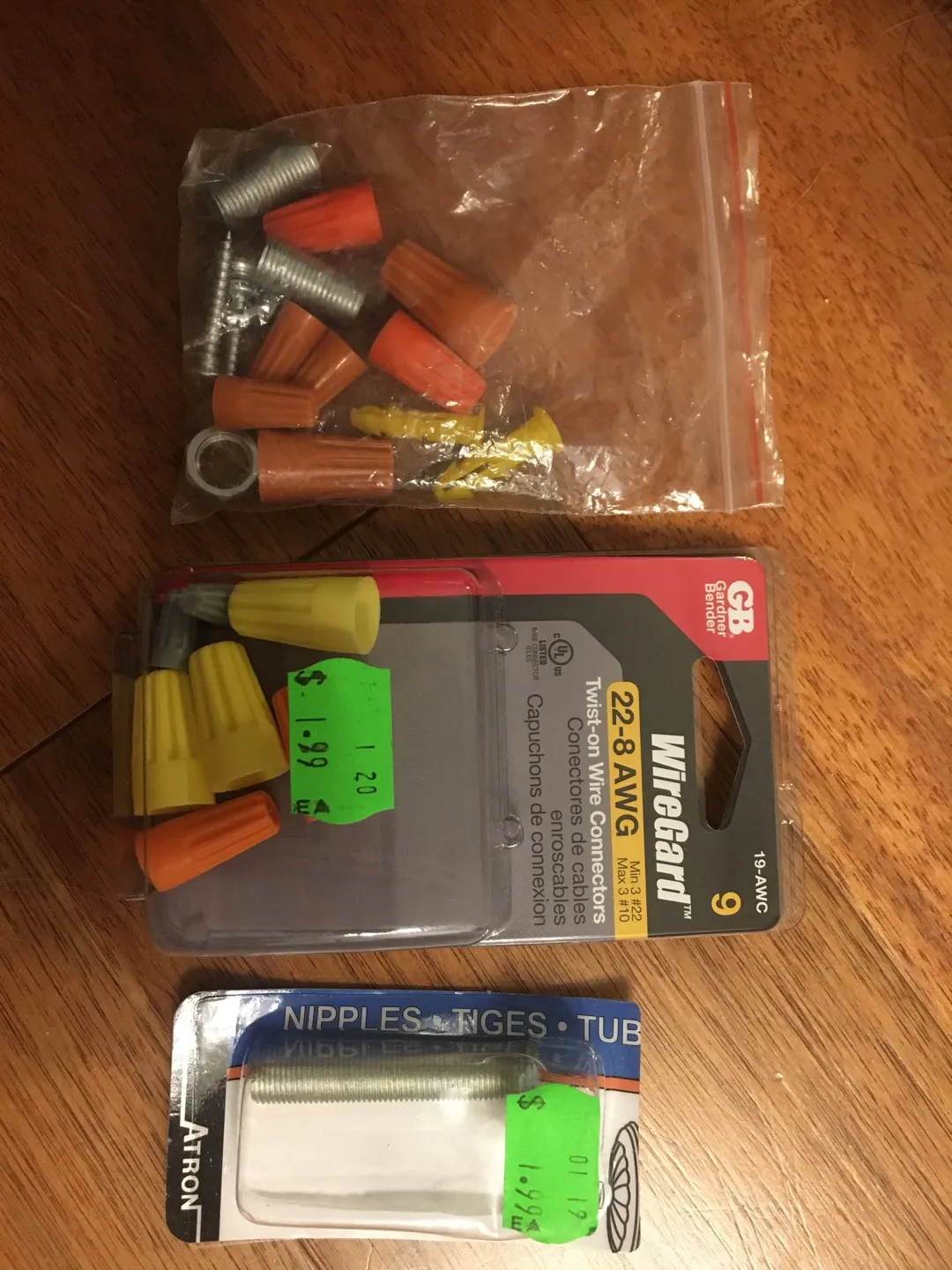 Random pieces that may be helpful when you install a new light fixture. Lots of sizes of twist on wire connectors, nipples of different lengths.