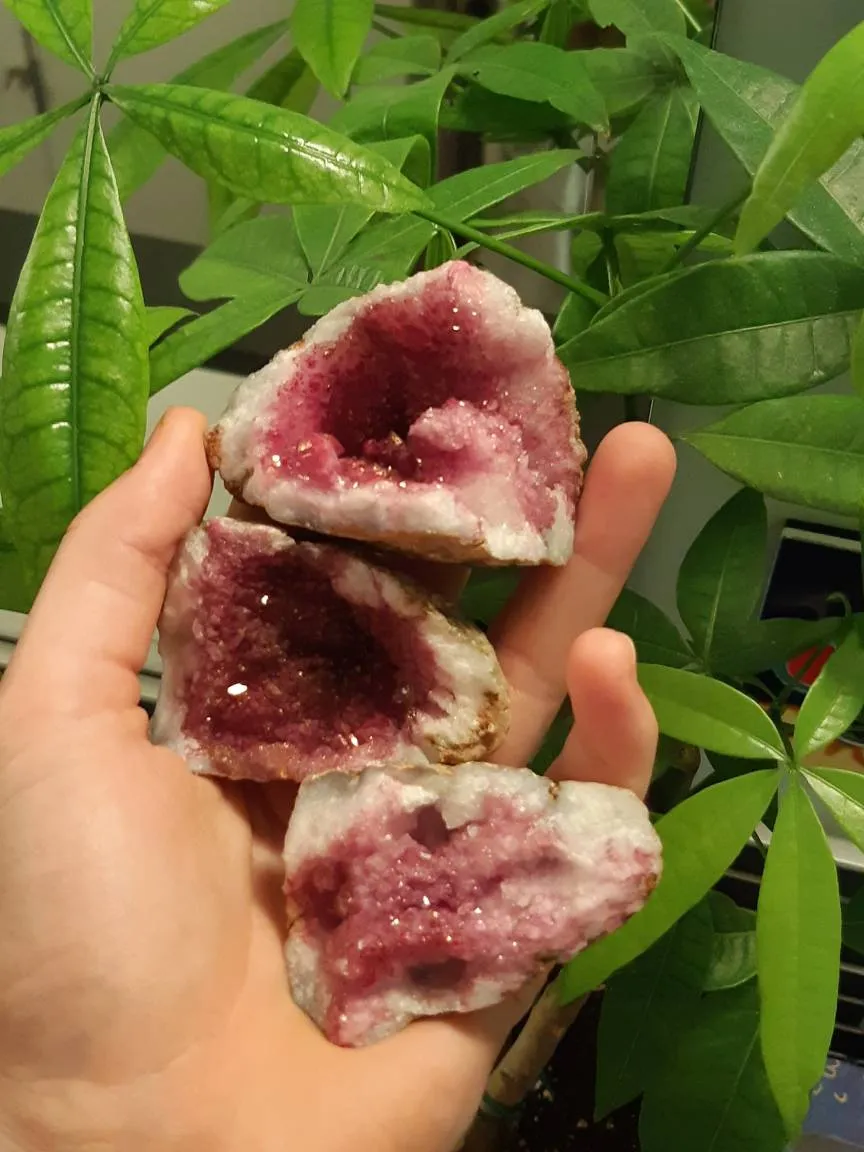 Beautiful crystal formations with gold shine. Makes a lovely little pop of colour to add to a decorative shelf or table! Rock can pretty much jigsaw back together perfectly, so no missing pieces/noticeable damage (aside from initial break to reveal crystals), pardon the strange comparison but it's roughly the size of a baked potato.