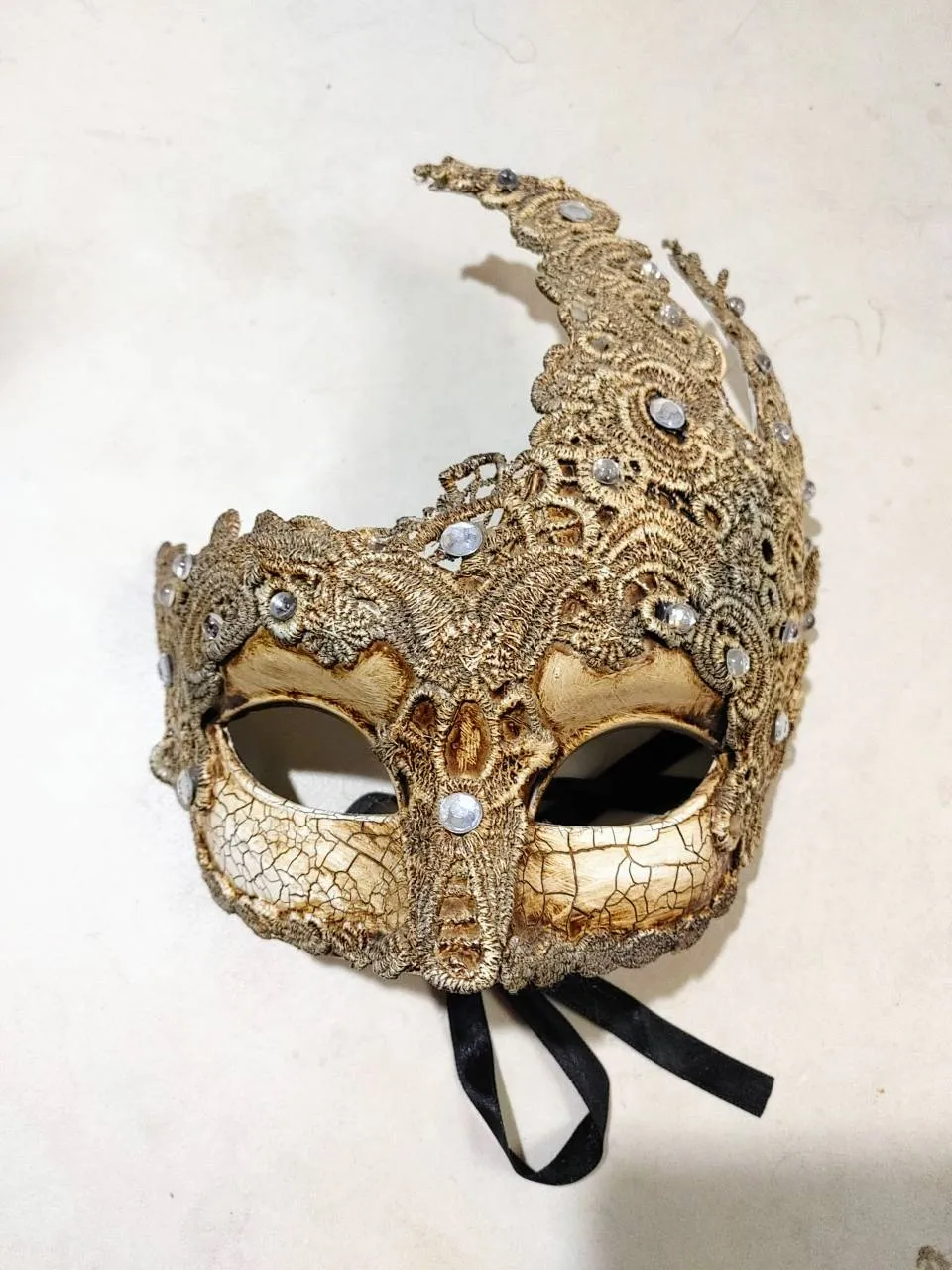 One of a kind beige, gold and rhinestone mask. Functional for wearing or for decorao.