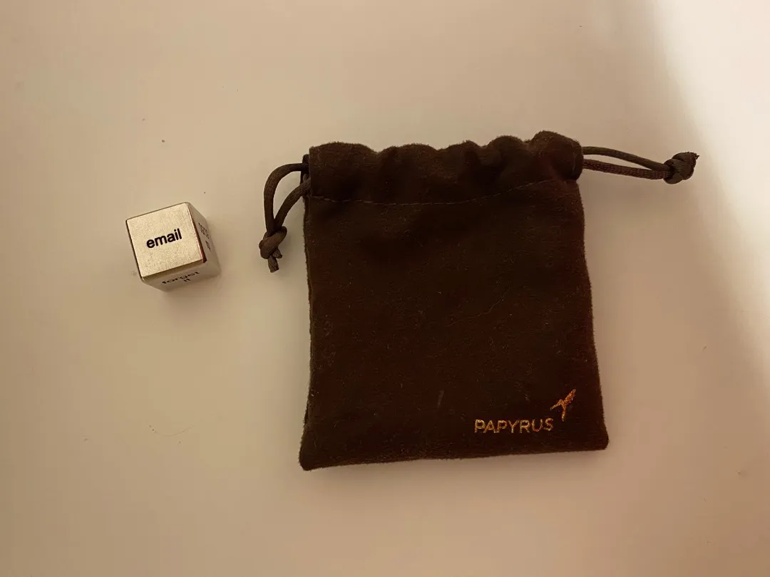 A dice for indecisive people From Papyrus Comes with dust bag No tarnish on dice, just finger prints LOL
