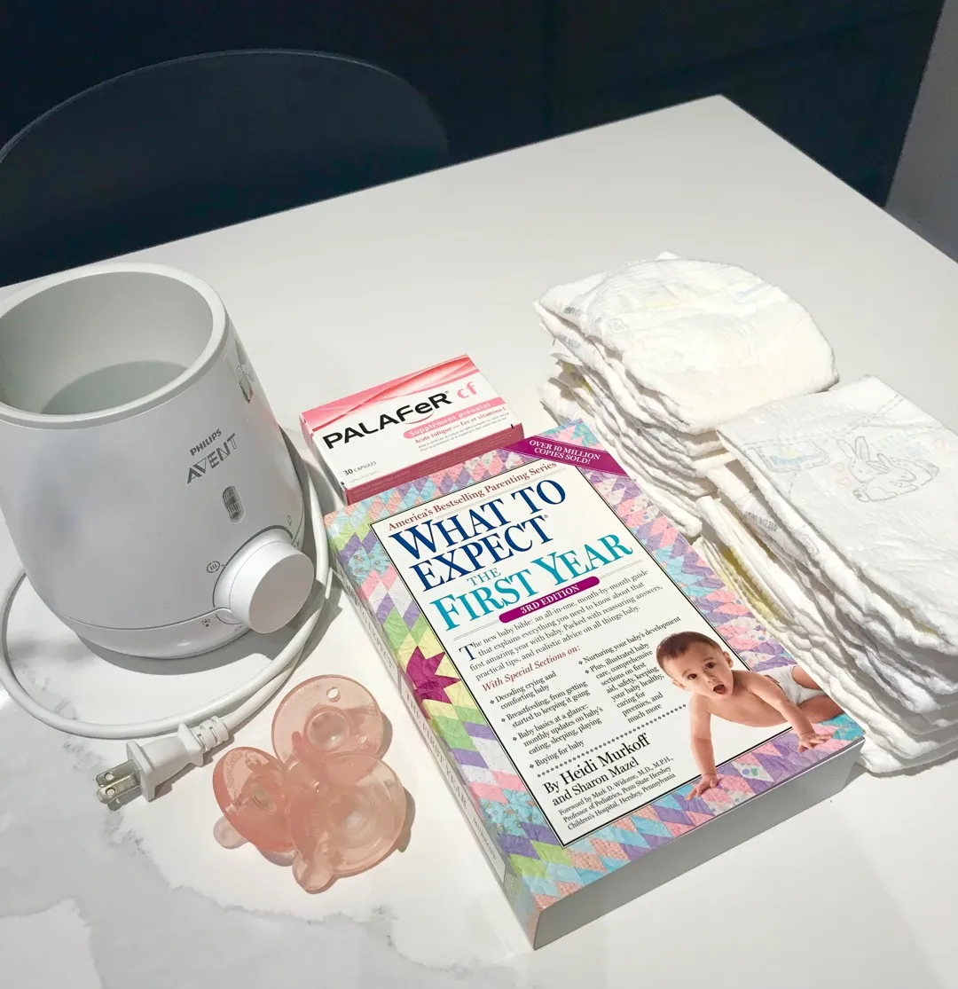 Items include: BN (without box) Avent Bottle Warmer BN 3 pink Avent binky’s BN What To Expect The First Year 14 newborn diapers Full box of Palafer prenatal and post birth iron supplements
