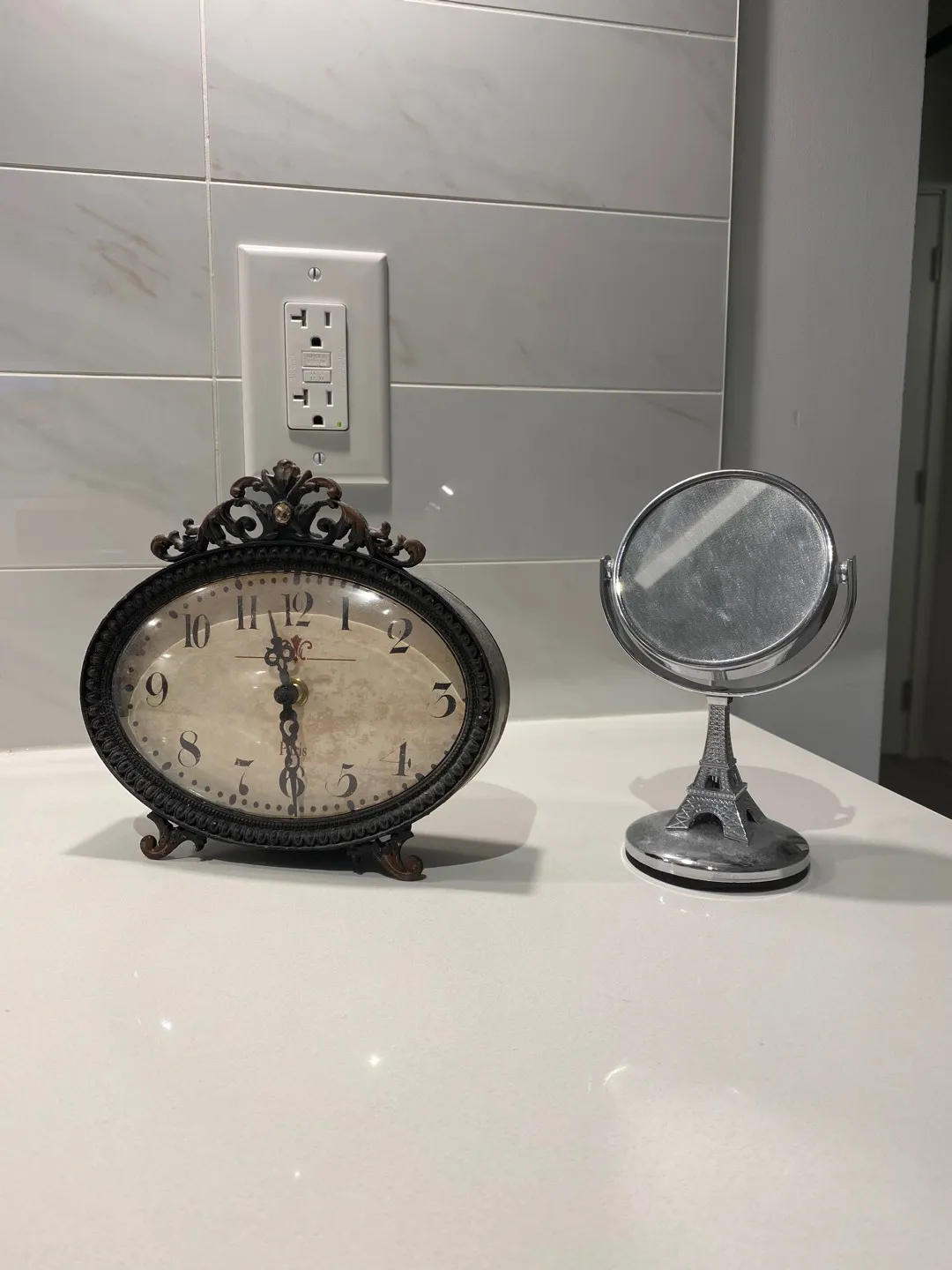 Clock and small Eiffel Tower mirror. Mirror can tilt at any angle and the clock works great, just needs a new battery.