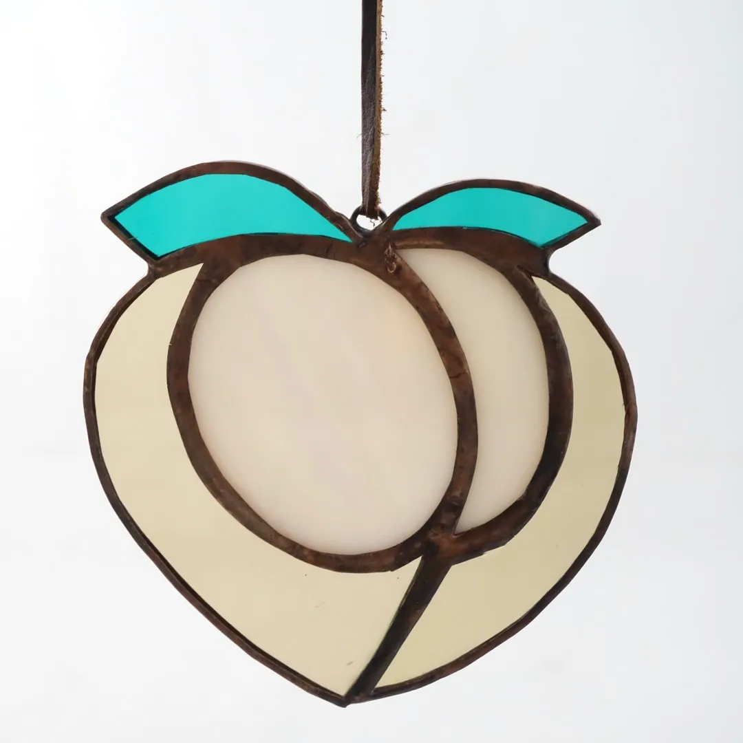 It’s pretty obvious... it’s a peach. Hang in your window to catch the light or against any wall. Opaque pink glass with peachy clear glass creates this version of the peach emoji.