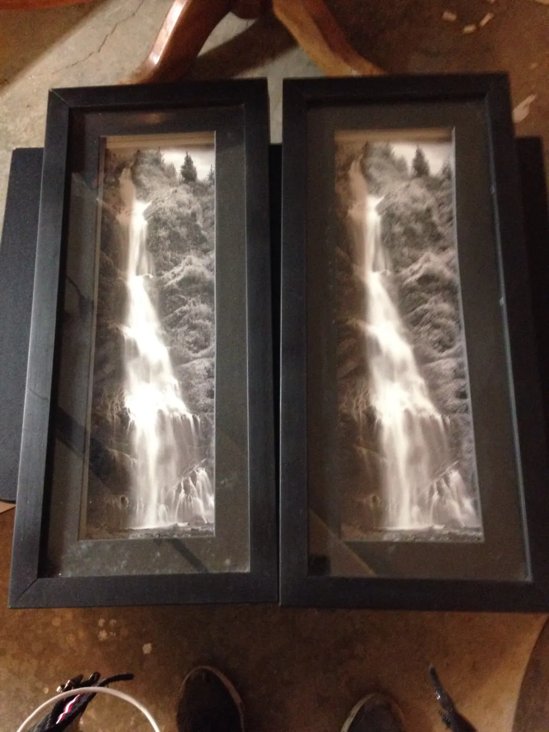 I have three picture in total. Two picture black and white waterfall. The other picture is rows of tree also black and white. The tree picture is good condition. The water fall picture a little nick here and there