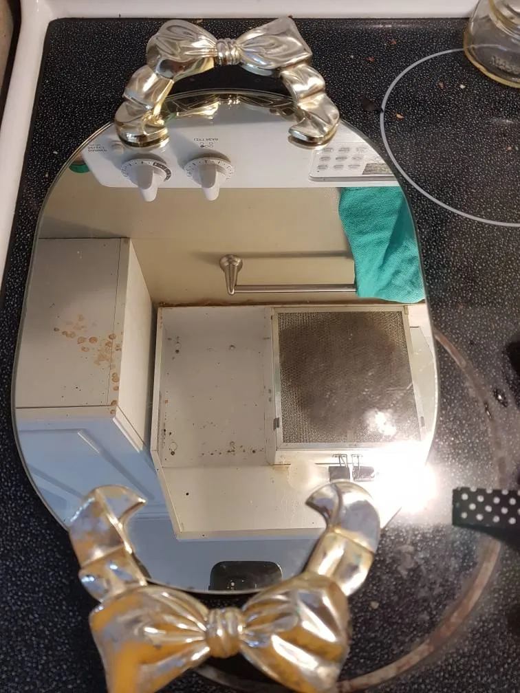 This is a platter with bows at the ends It is glass and made as a mirror, I do not use it or need it. Any offer will do.
