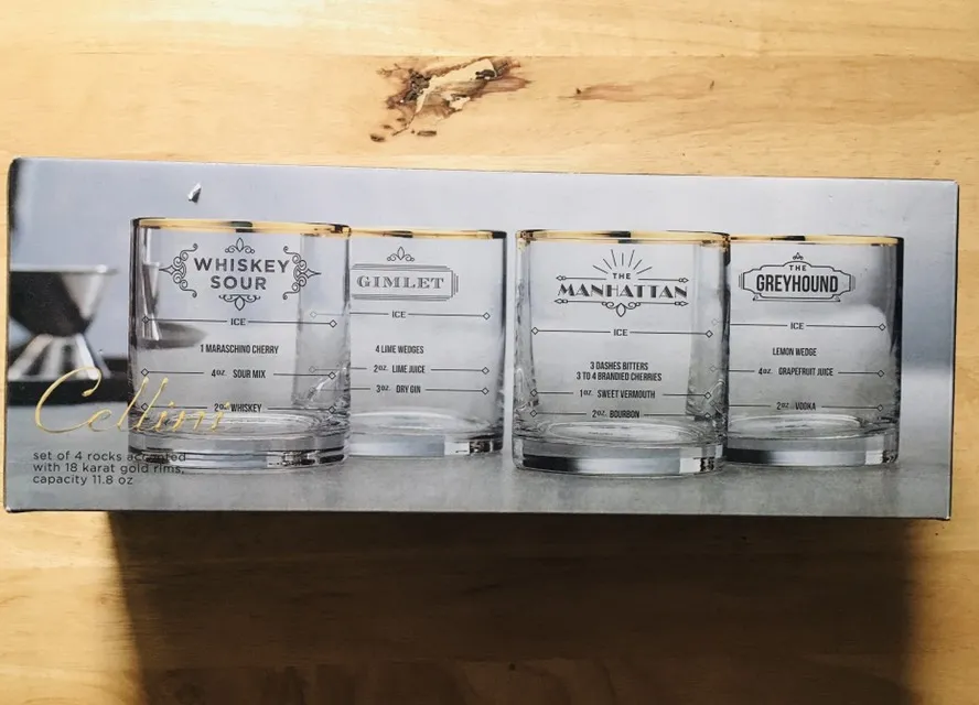BNIP rock glasses with 18 carat gold rims and recipes printed on the glass.