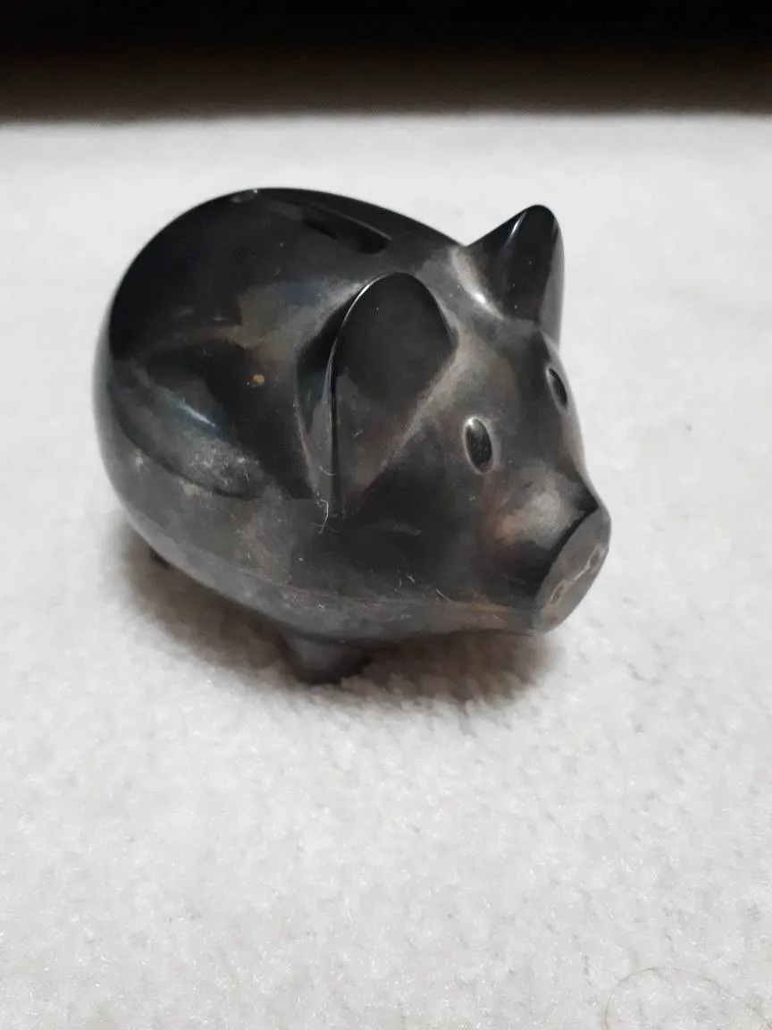 Has removable cover underneath to easily take money out and feet have felt on the bottom. Has some remnants of a sticker on one side that I couldn't fully remove (second picture) and is a bit tarnished.