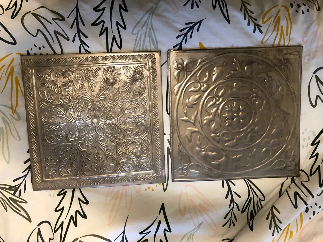 Two tin tiles, 12”x12”. Attached hangers. Pick up/meet Commercial Drive or work hours Broadway and Burrard.