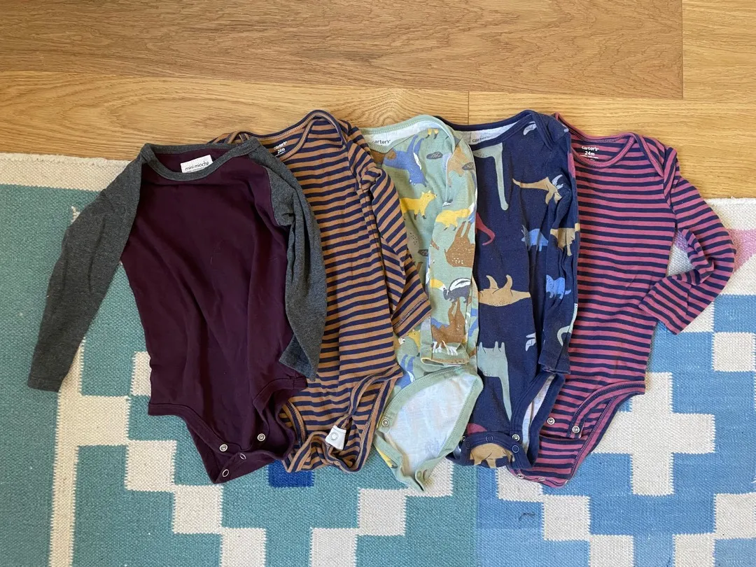 Five toddler snap long sleeve onesies Unisex cute patterns Mini mioche on the left and the rest are Carters