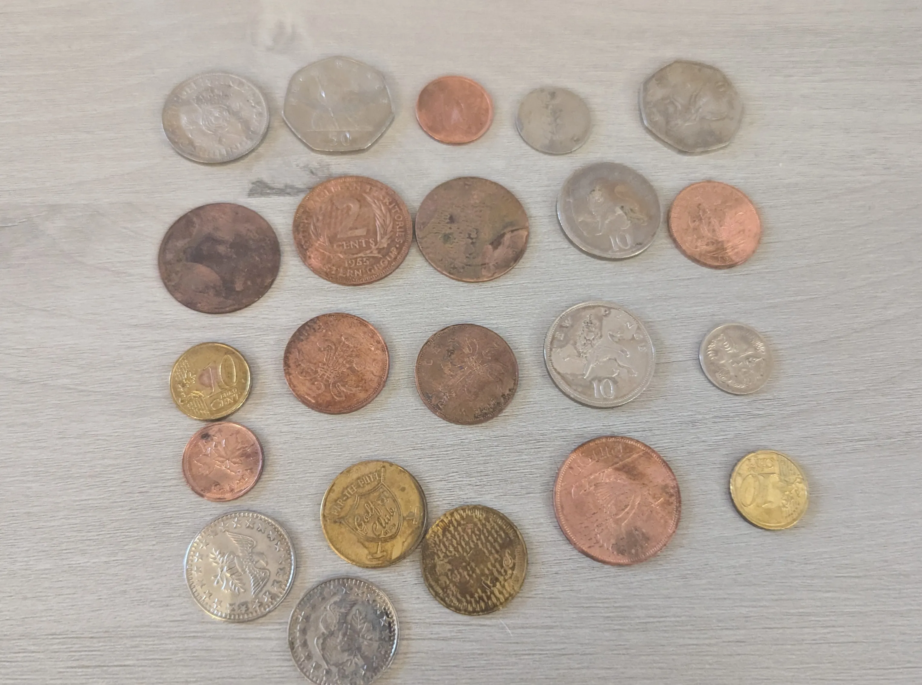 Variety of foreign coins. Different denominations and countries represented. Some tarnish and wear visible. Great for collectors or enthusiasts.