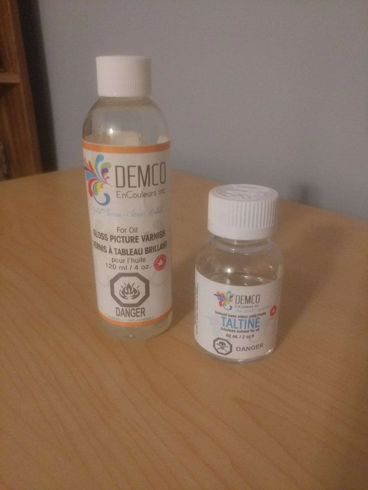 Small bottles of varnish for oil painting and taltine (solvent). More than 3/4 full.