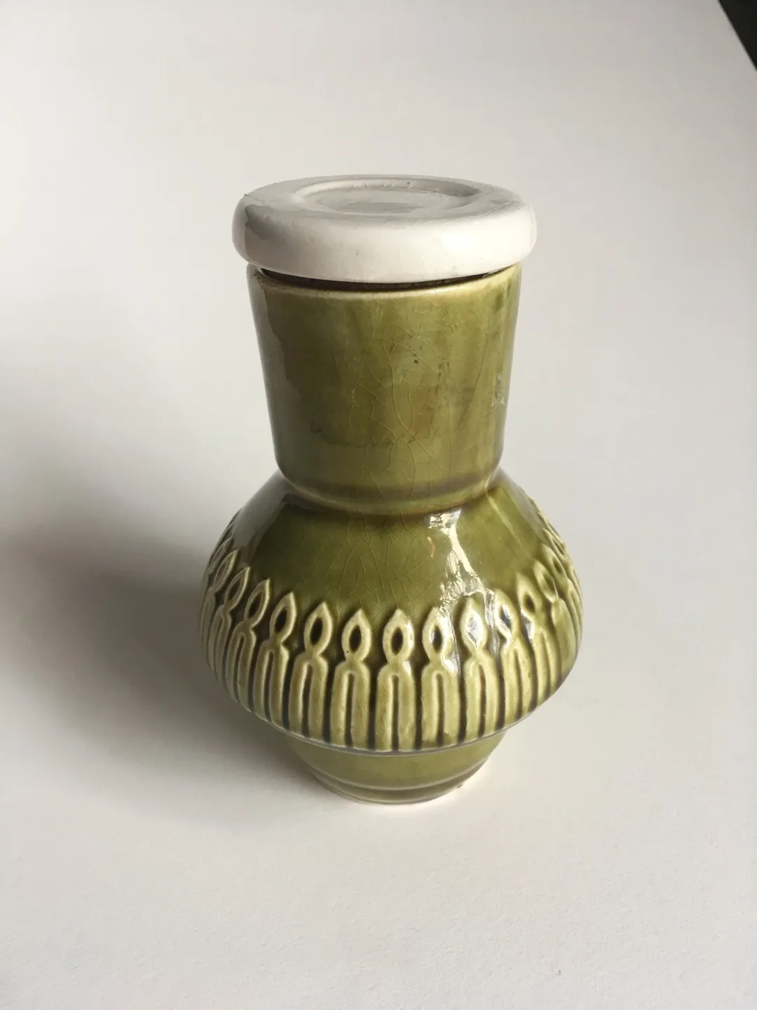 Made in Japan, midcentury pottery, cork lid. Rough condition on the cork. Great for that home decor piece. About 6” tall