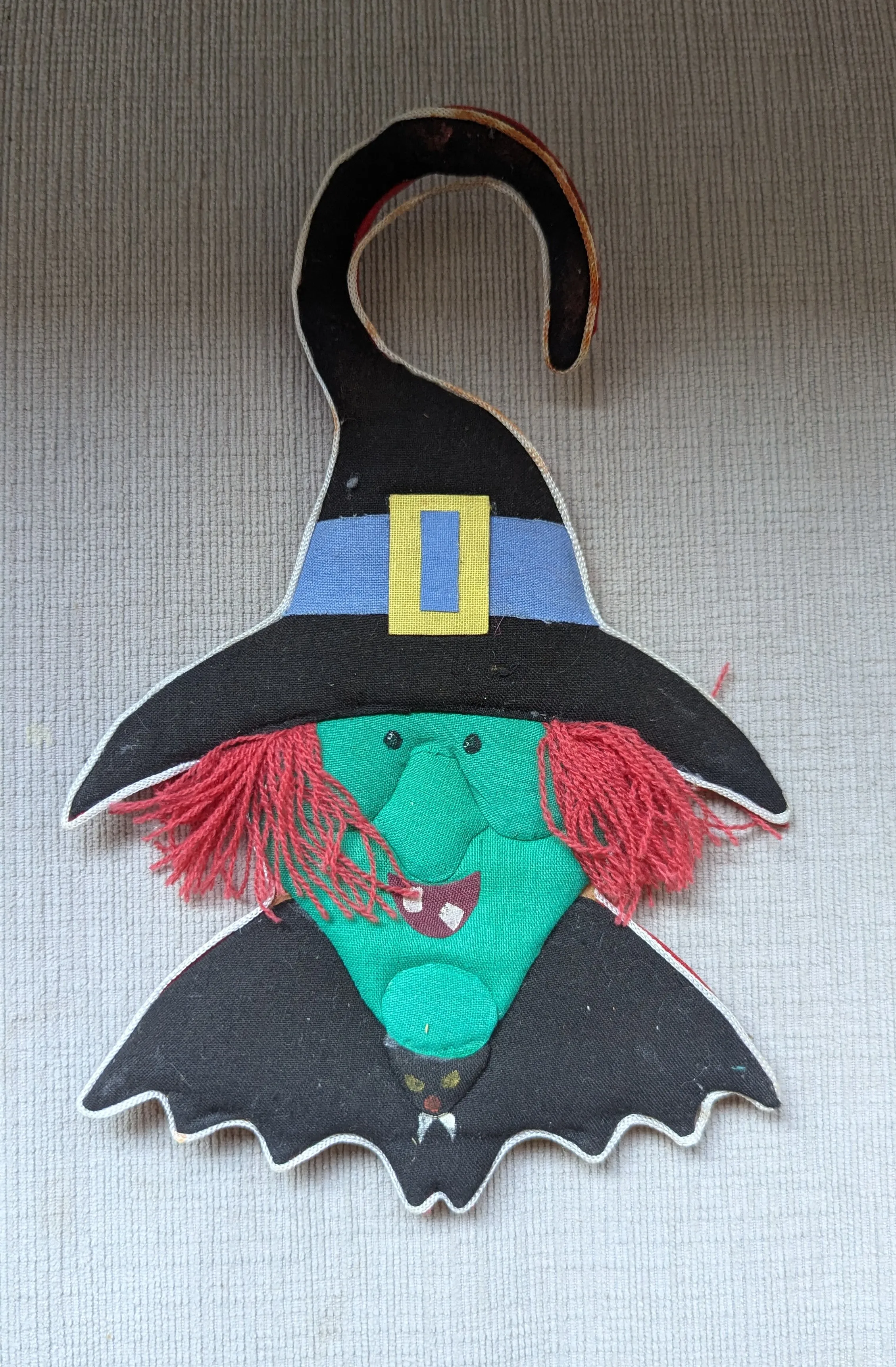 Handmade witch decoration. Has a hook on the top to hang. Great for Halloween decor.