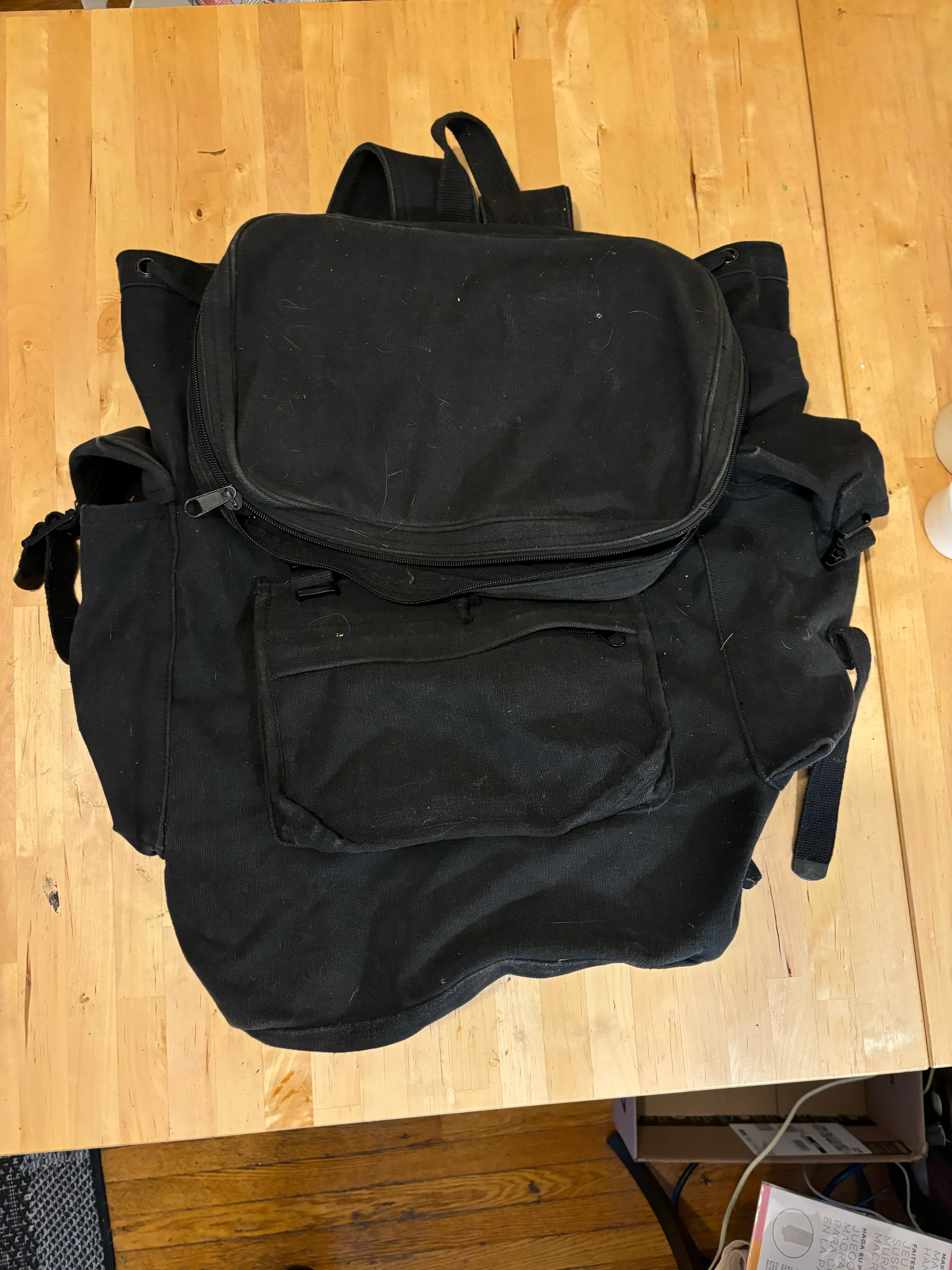 Originally purchased from Army Surplus. Black canvas bag (aprox 30 litres) with side, front, and top pockets. No zippers.