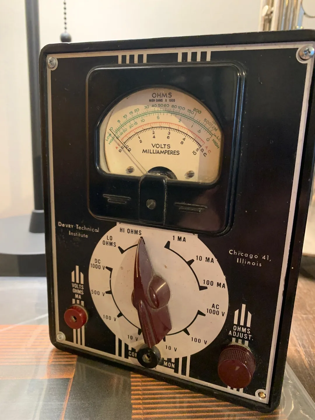 Heavy duty, “DeVRY Technical Institute”, made in Chicago. I have no idea if it’s working or not. Great shelf piece, stands 7” tall. ISO or try me!