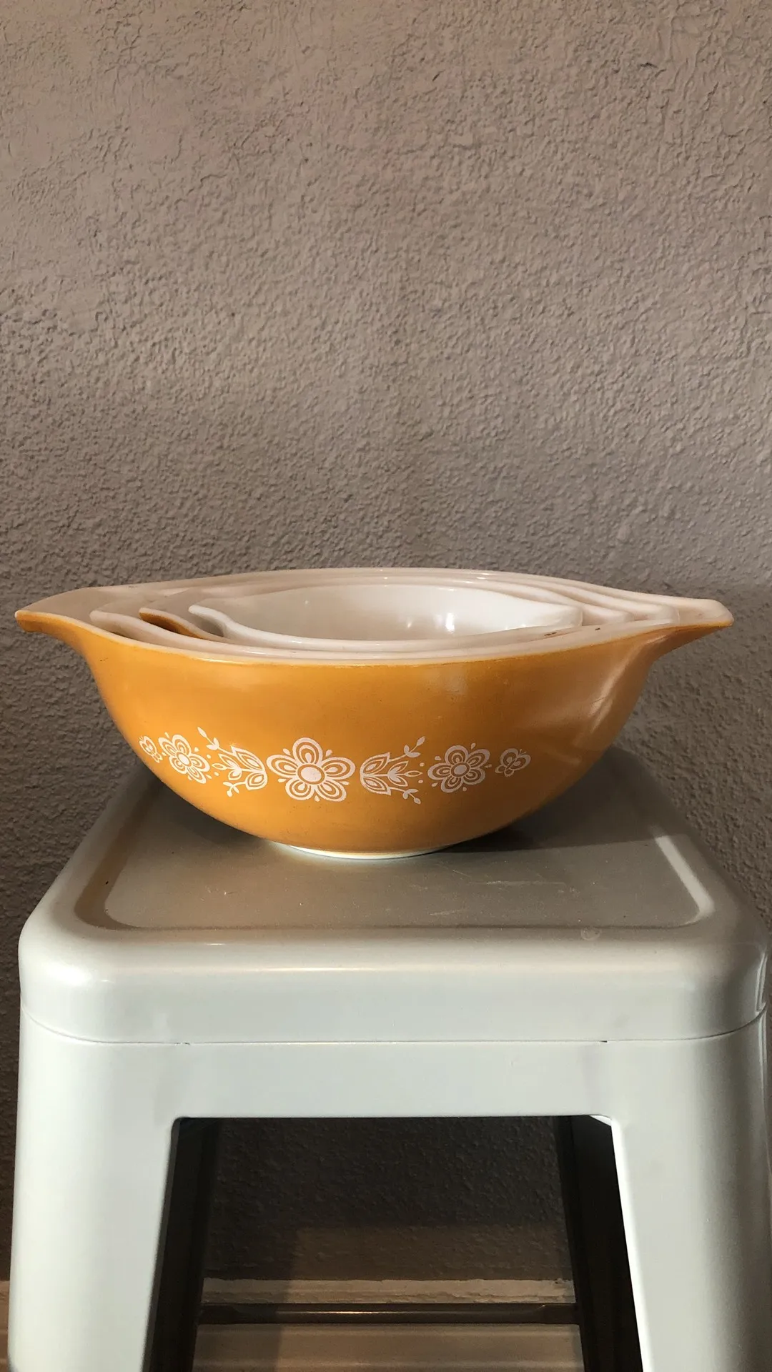 This is a good condition vintage Pyrex ”Butterfly Gold” 4 piece mixing bowl set. There is some wear given the age but no cracks or chips.