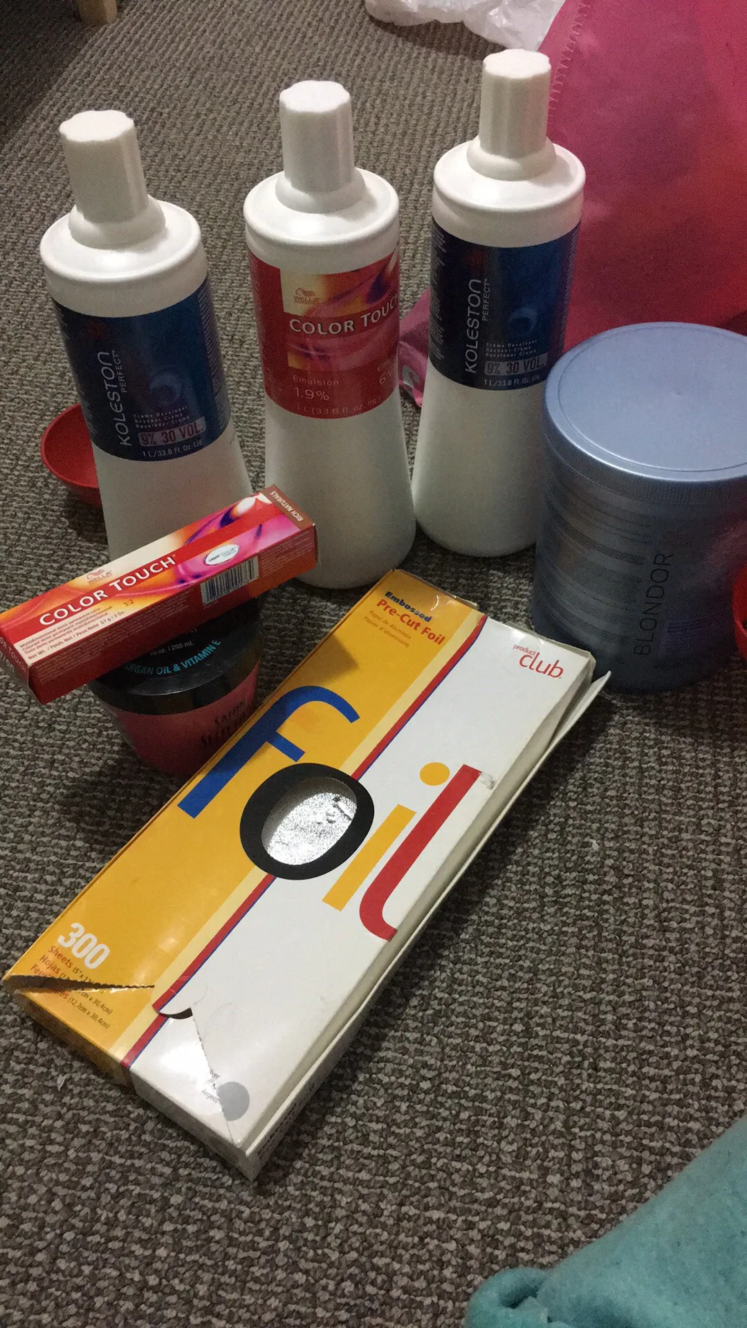 ♦️ Koleston 30 Vol Creme Developer (1 full bottle plus a bit of a 2nd bottle) ♦️ Wella Colour Touch Emulsion 1.9% (almost full) ♦️ Wella Colour Touch: Rich Naturals (a bit left) ♦️ Wella Blondor Bleach (a bit left) ♦️ Product Club Embossed Pre-Cut Foil (5” x 12”) (almost full)