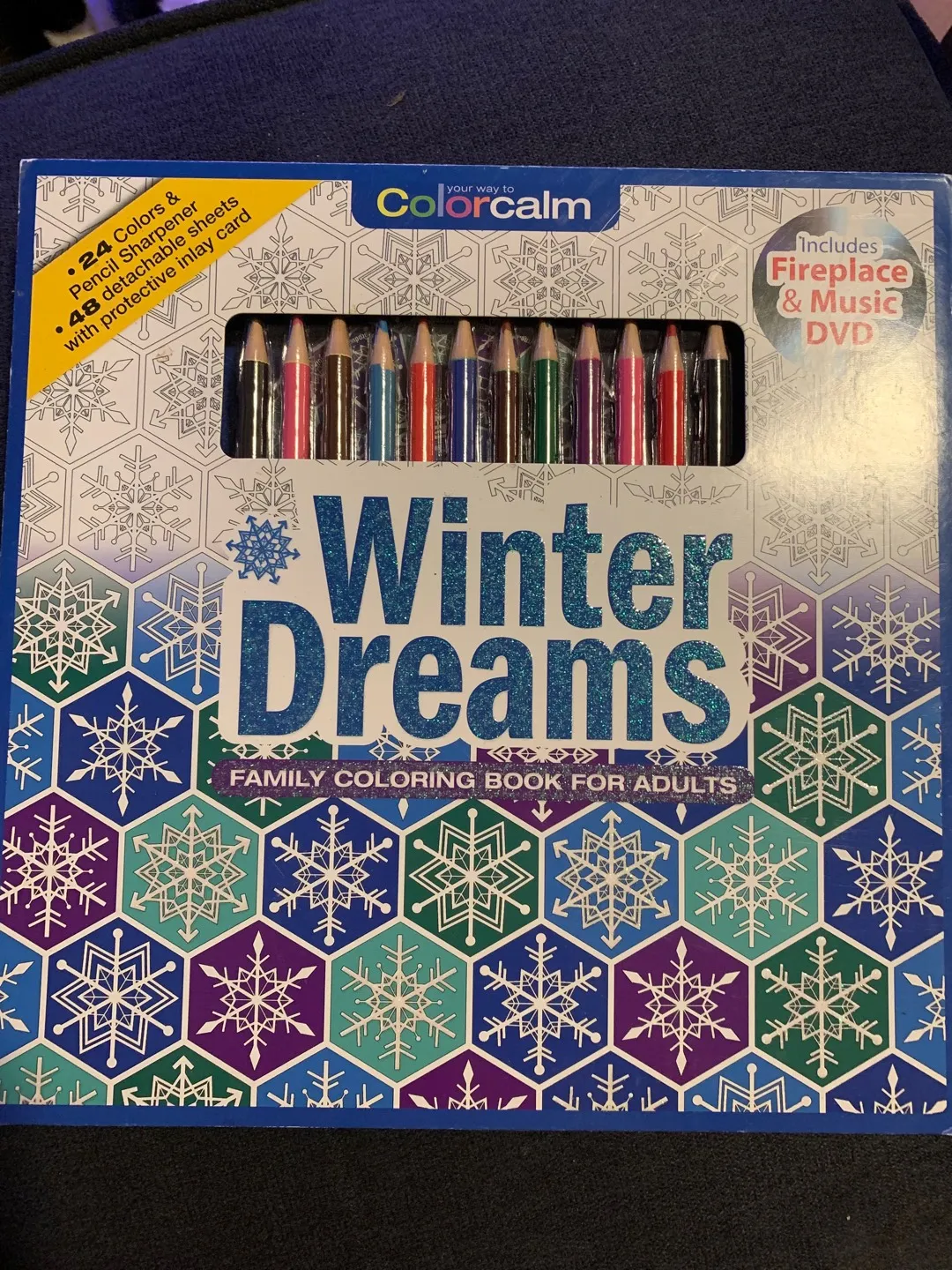 Colour pencils Metal sharpener DVD/CD that plays music while showing a fireplace on Colouring pages that are easy to remove to share with friends and family