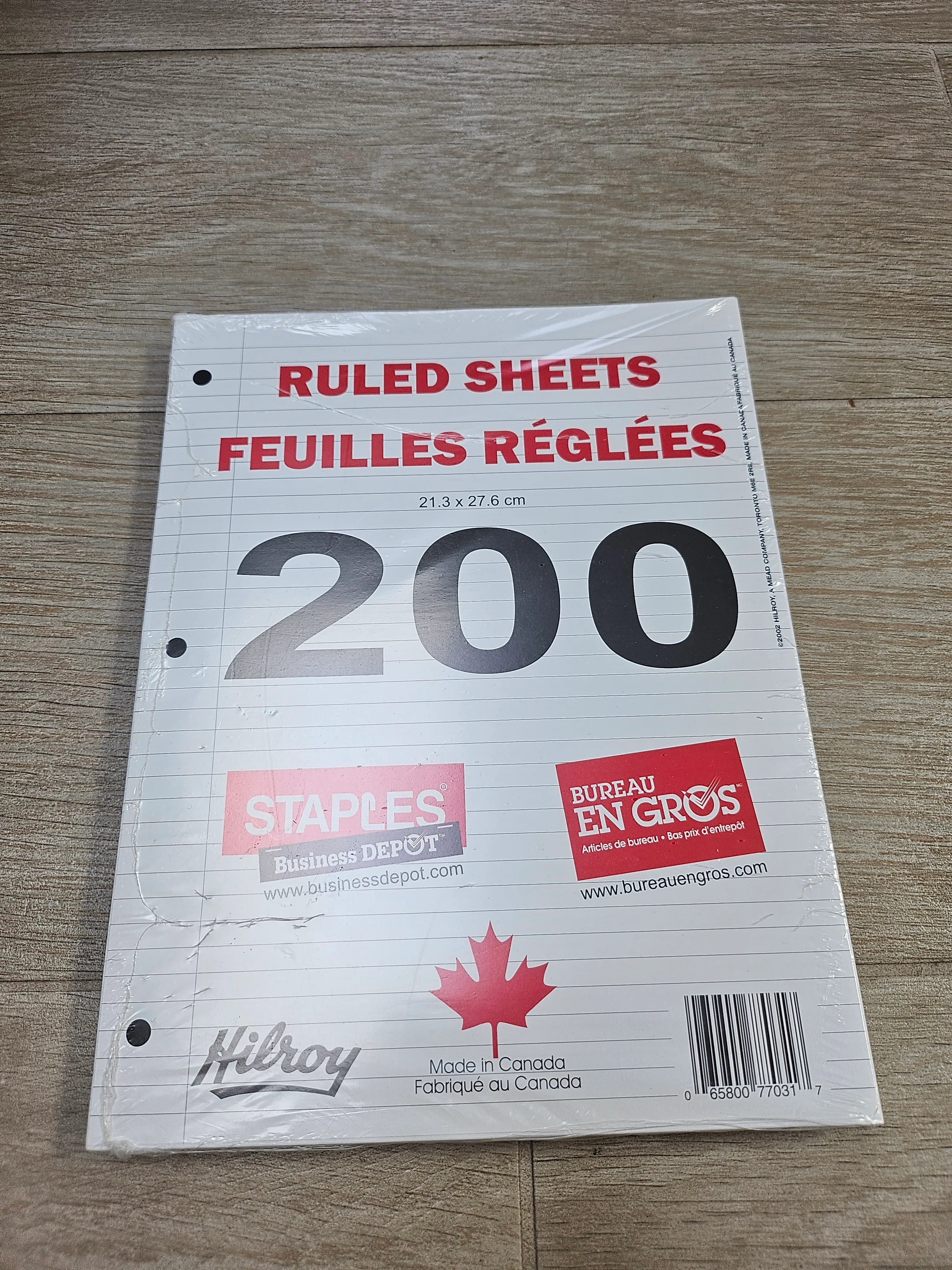 Have 3 packs of lined paper. Each pack has 200 sheets. Has holes for 3-ring binders. Brand new, never opened.
