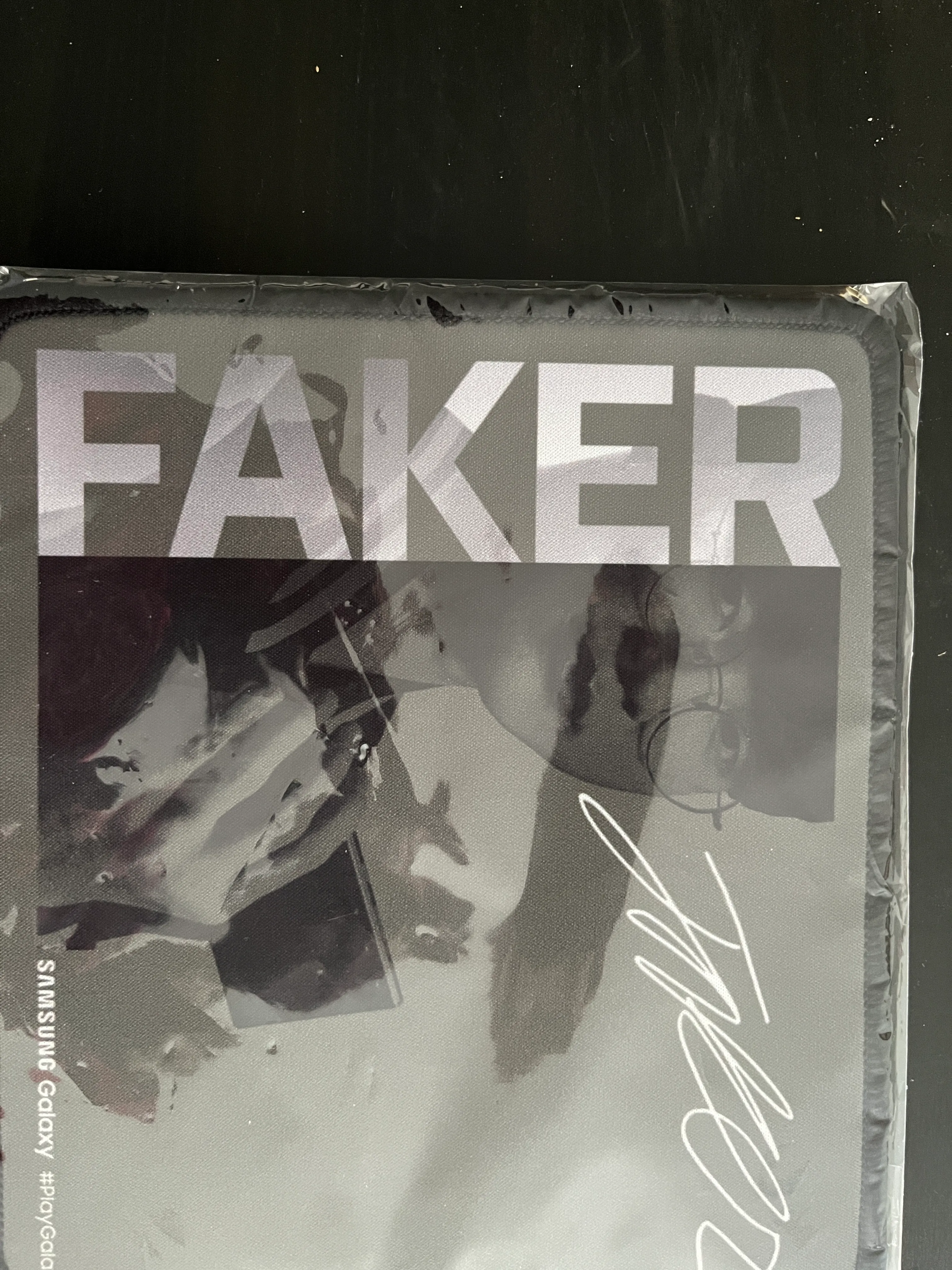 This is a new mousepad featuring Faker, a professional League of Legends player. It features his signature and Samsung Galaxy branding. It is black and packaged.