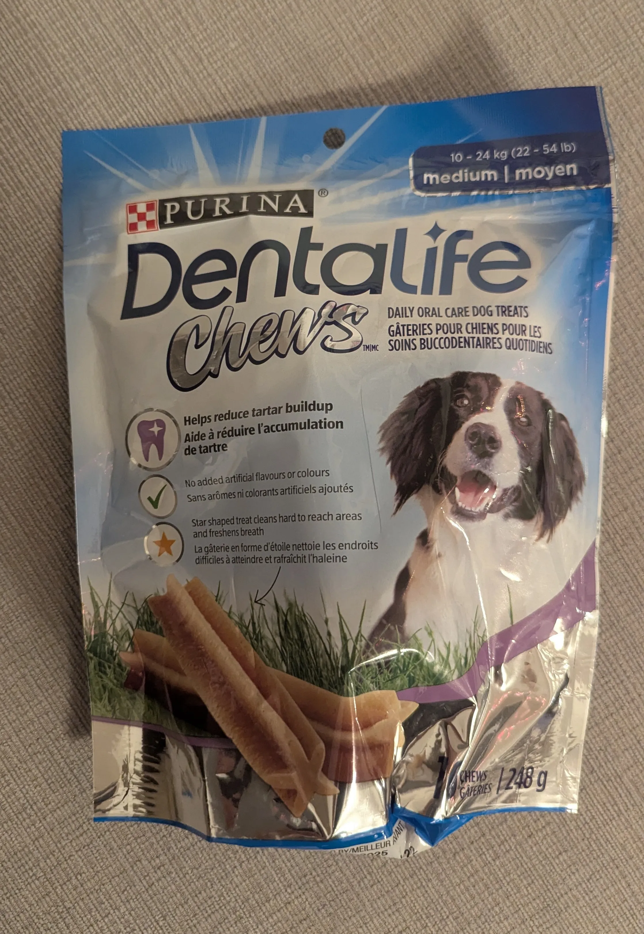Bag of Purina Dentalife Chews dog treats. Star-shaped treats for cleaning hard to reach areas. Helps reduce tartar buildup and freshens breath. Medium dog size. Best before March 2025.