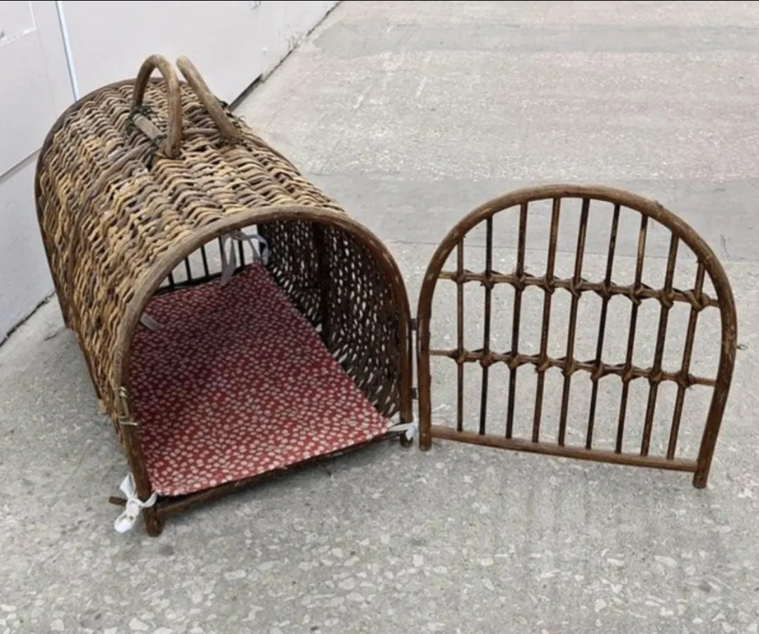 A vintage wicker pet carrier. It is a great piece for displaying or using as a pet carrier. This carrier would be perfect for a small dog or cat. It features a removable door for easy access.