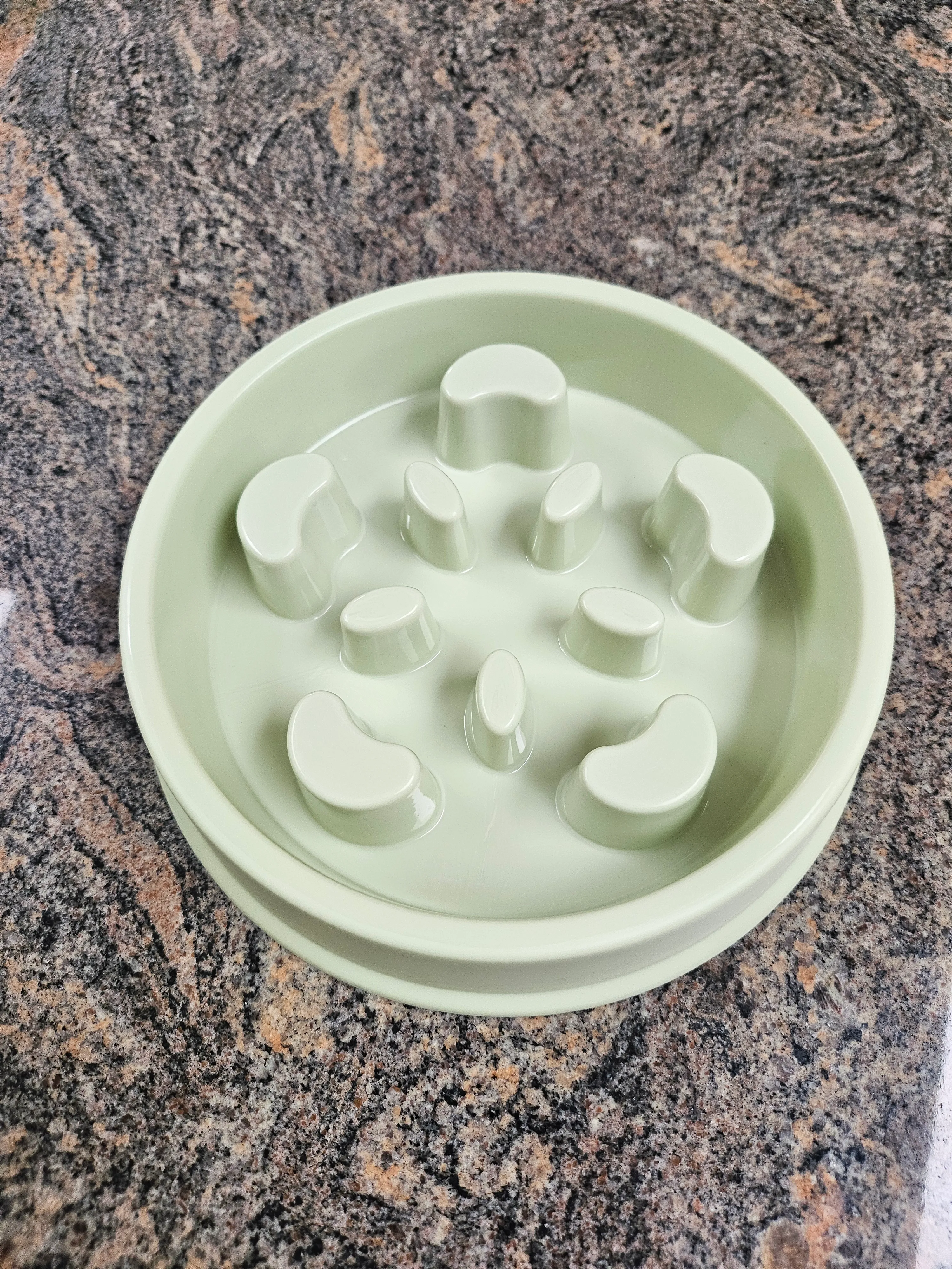 Dish to help dogs slow down while eating. Makes eating a little more fun by getting them to lap up the food along all those crevices.