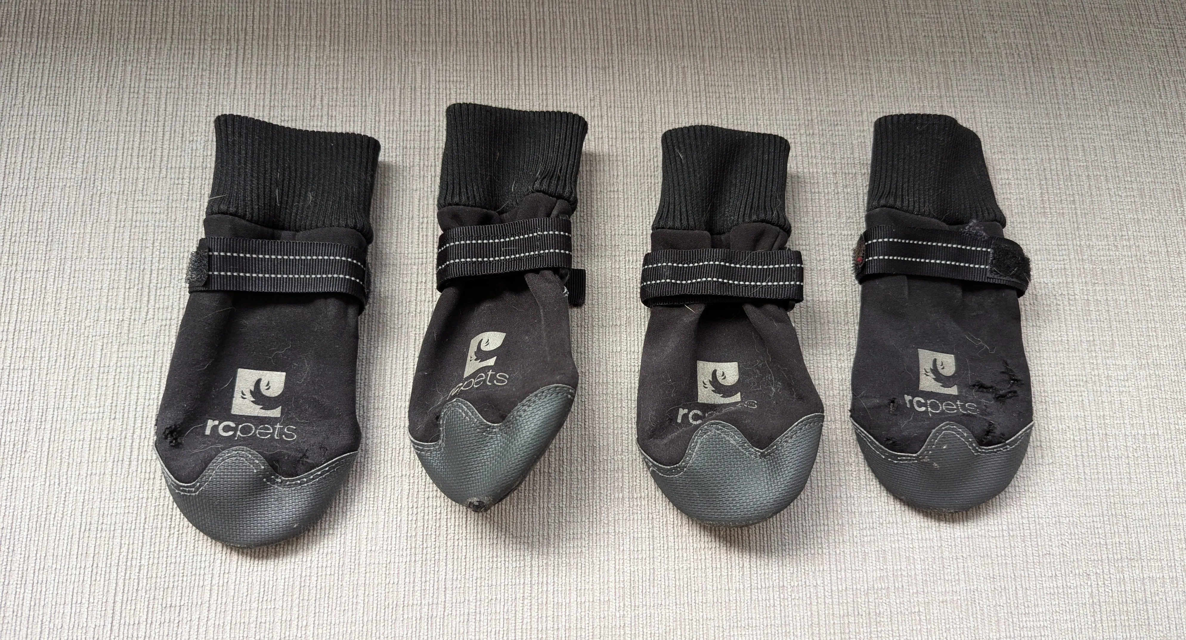 Set of four used dog boots. Black fabric with grey soles. Velcro closures. Show wear and tear.