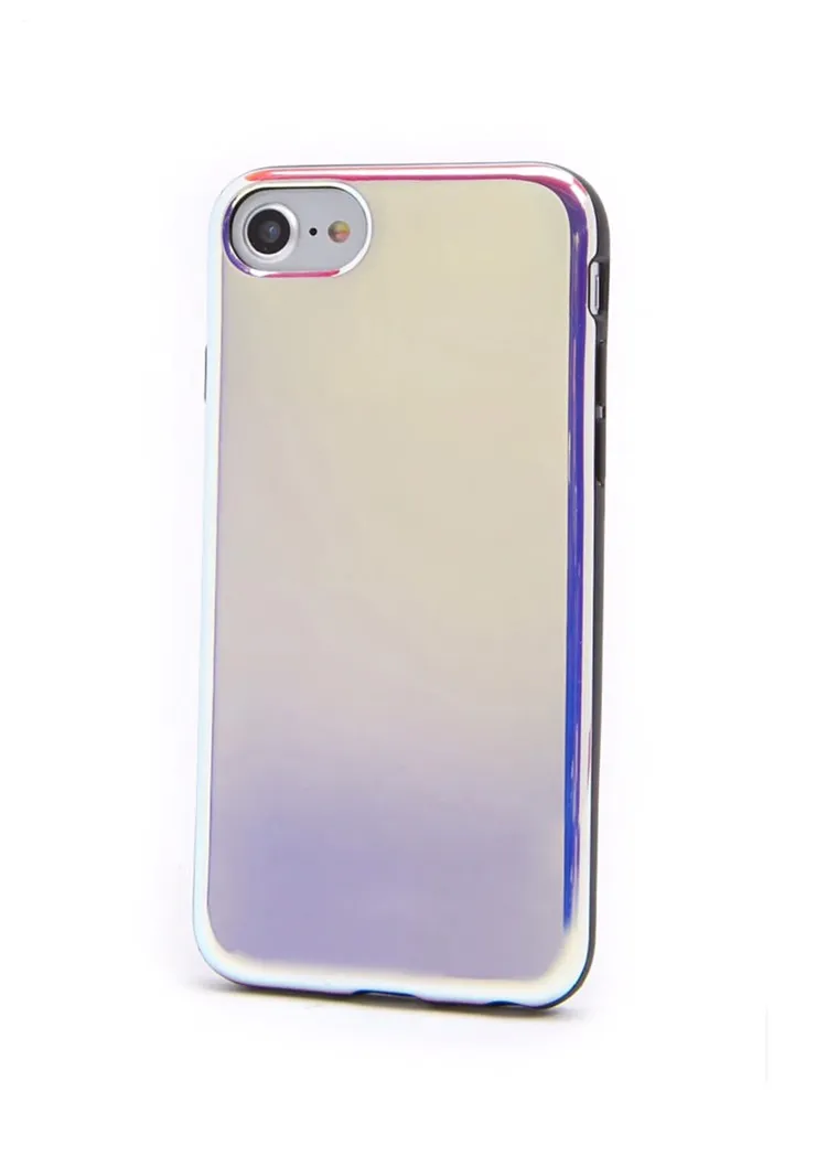 A brand new, never used (except for these photos) soft shell iPhone case with an iridescent design, but looks orange-pink or blue depending where the light hits.
