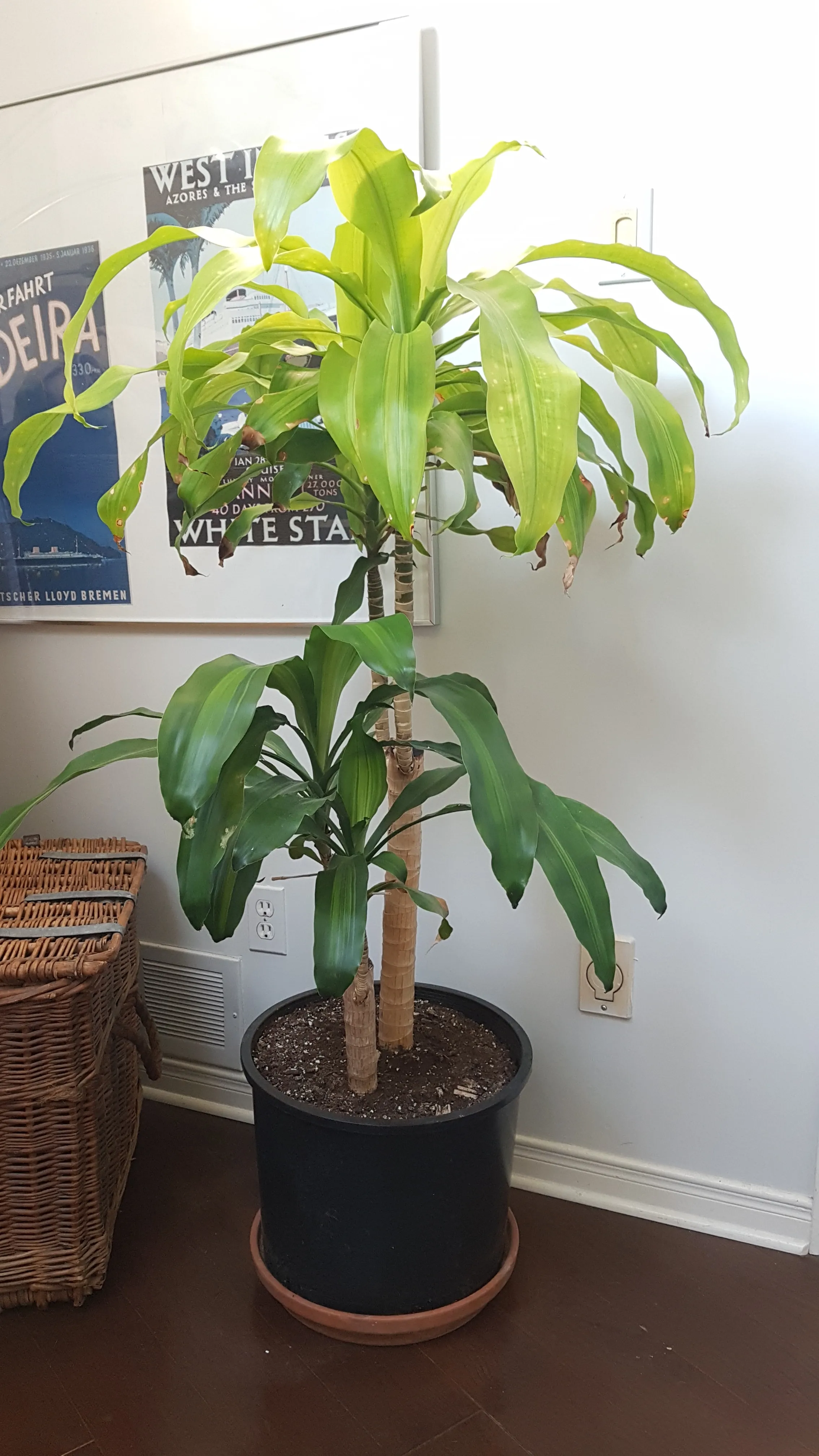Large Dracaena (Corn plant), 4.5ft tall. No bugs, always indoors. Pot is 15" wide, comes with clay water saucer. Easy to care for, drought friendly, needs bright indirect or filtered sunlight.