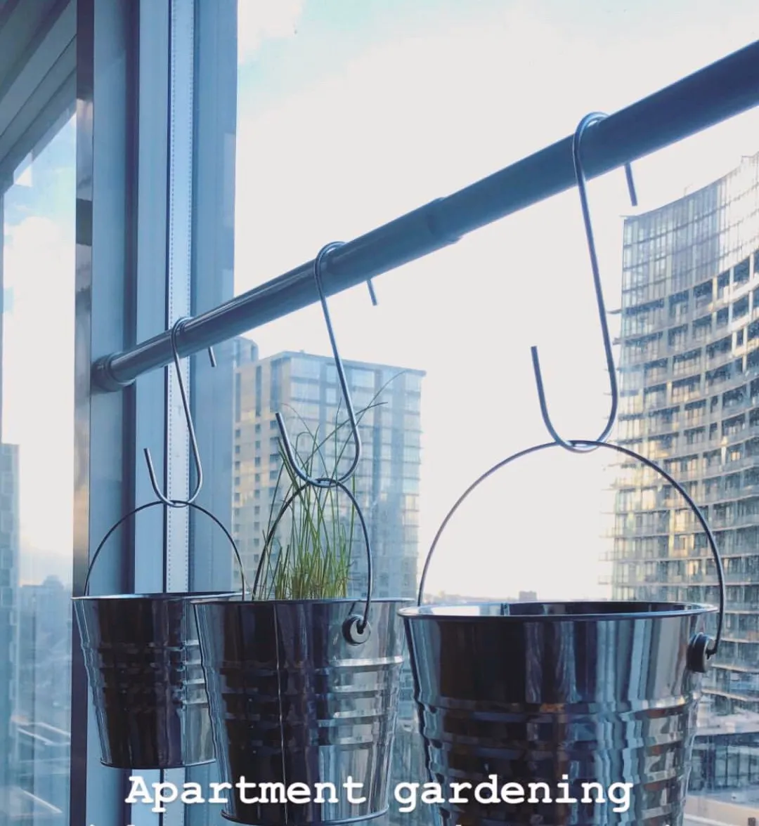 Selling this DIY hanging planter (plants not included). I was using this setup to grow herbs. Comes with an adjustable tension rod (fits a bunch of sizes), and 2 tin buckets with S hooks.