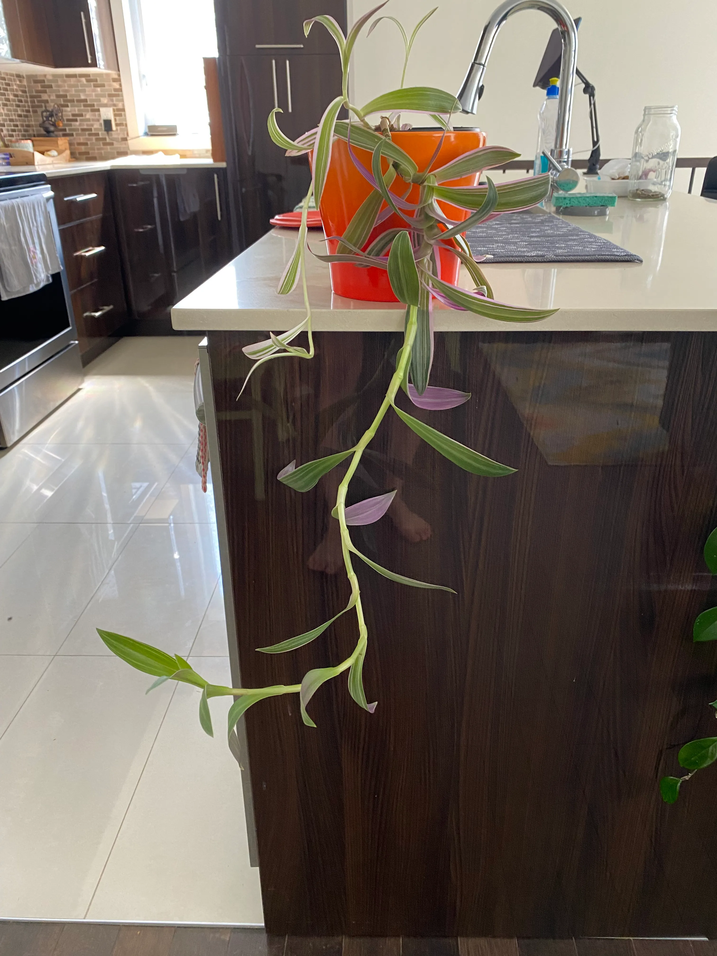 Healthy but slightly leggy plant, it has beautiful purple-green leaves. Its longest vine is over a foot long. Comes without the orange pot.