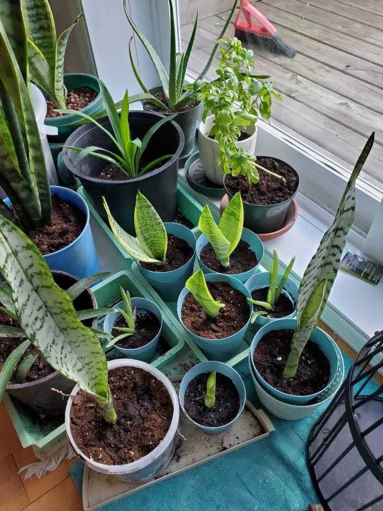 Sanseviera repotted with rocks in the bottom two kinds available. Wider with light border (3 middle pots) or narrower pale with dark green tiger stripes (3 bottom pots). Meeting in VSL or near Villa Maria strongly preferred.