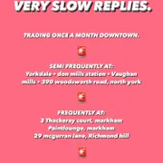 🏡Lives in Richmond Hill, can trade in Markham , Don Mills Stn, Yorkdale, Hillcrest & Vaughan Mills frequently. Also at a specific address in North York every week (about 8 minutes from Fairview), Yonge and Eg for big trades, Downtown core every 3 week... More